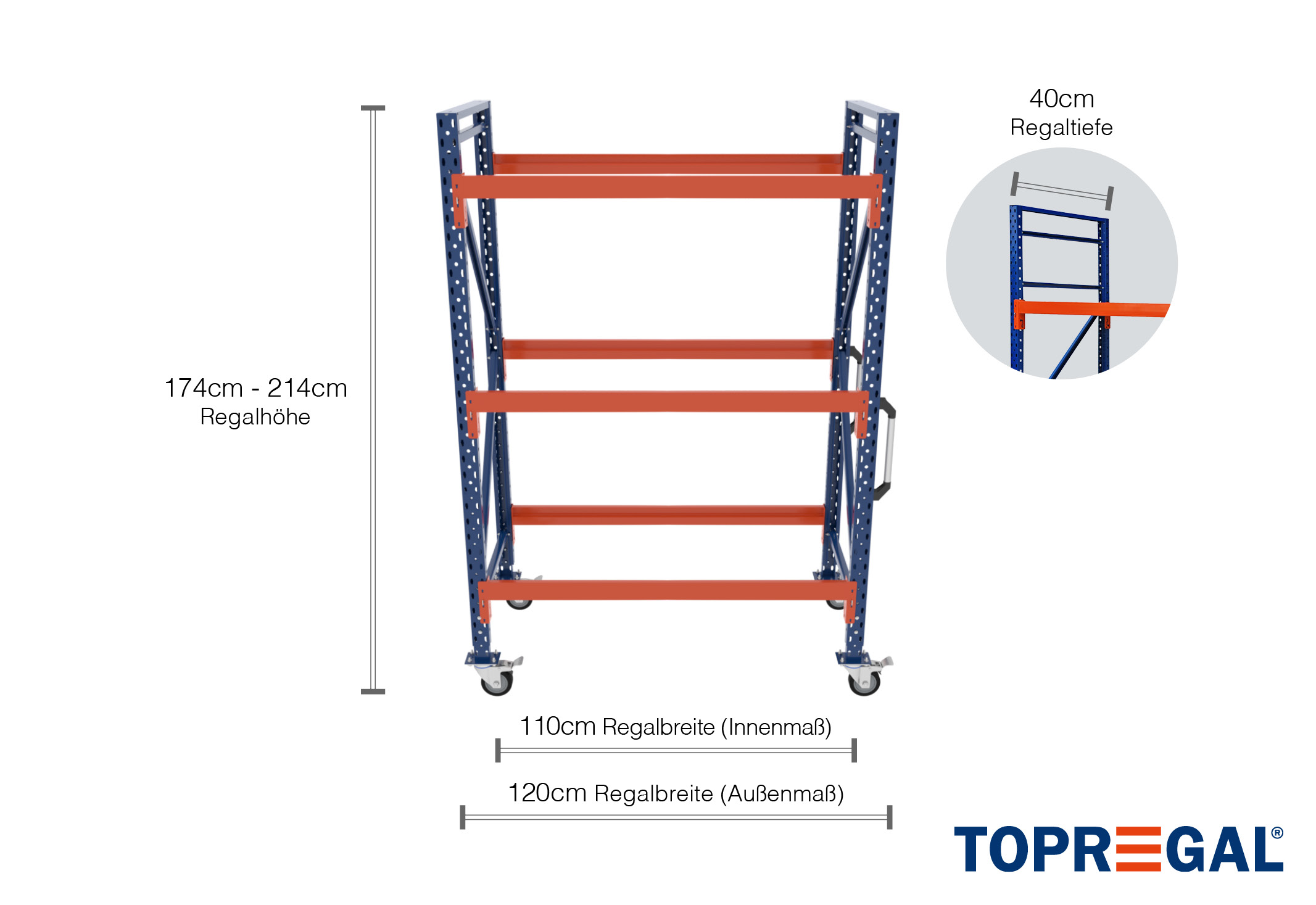 Pojízdný regálový stojan (modrý práškový lak) se skládá z předního a zadního profilu stojanu a 2 pohyblivých koleček vybavených zajišťovacími brzdami. Regálové stojany jsou nahoře uzavřeny dvěma speciálně vyrobenými krycími panely pro zvýšení bezpečnosti práce a pro plynulé zakončení rohů a hran. Krycí panel se nasazuje a snadno se tak upevní.