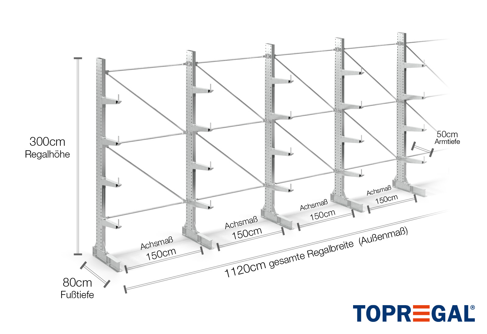 Tento konzolový regál v jednostranném provedení o šířce 11,2 m je vysoký 3 m, má celkovou hloubku 80 cm a disponuje 4 úrovněmi konzolových ramen o hloubce ramene 50 cm. Maximální nosnost na rameno činí max. 500 kg. Konzolová ramena lze individuálně zavěsit v rastru po 50 mm a zajistit pojistnými čepy. Jako skladovací úroveň lze (v závislosti na zboží) využít také patky. Na ochranu nákladu před náhodným sklouznutím lze na konec každého konzolového ramene nasadit pojistku proti pádu. Ta je standardně součástí dodávky.