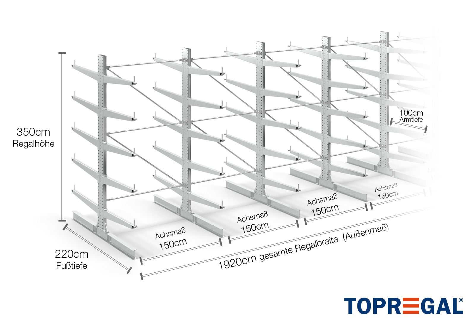 Tento konzolový regál v oboustranném provedení o šířce 19,2 m je vysoký 3,5 m, má celkovou hloubku 220 cm a disponuje 5 úrovněmi konzolových ramen o hloubce ramene 100 cm. Maximální nosnost na rameno činí max. 500 kg. Konzolová ramena lze individuálně zavěsit v rastru po 50 mm a zajistit pojistnými čepy a kolíky. Jako skladovací úroveň lze (v závislosti na zboží) využít také patky. Na ochranu nákladu před náhodným sklouznutím lze na konec každého konzolového ramene nasadit pojistku proti pádu. Ta je standardně součástí dodávky. Svislé zatížení je maximálně 3.000 kg.