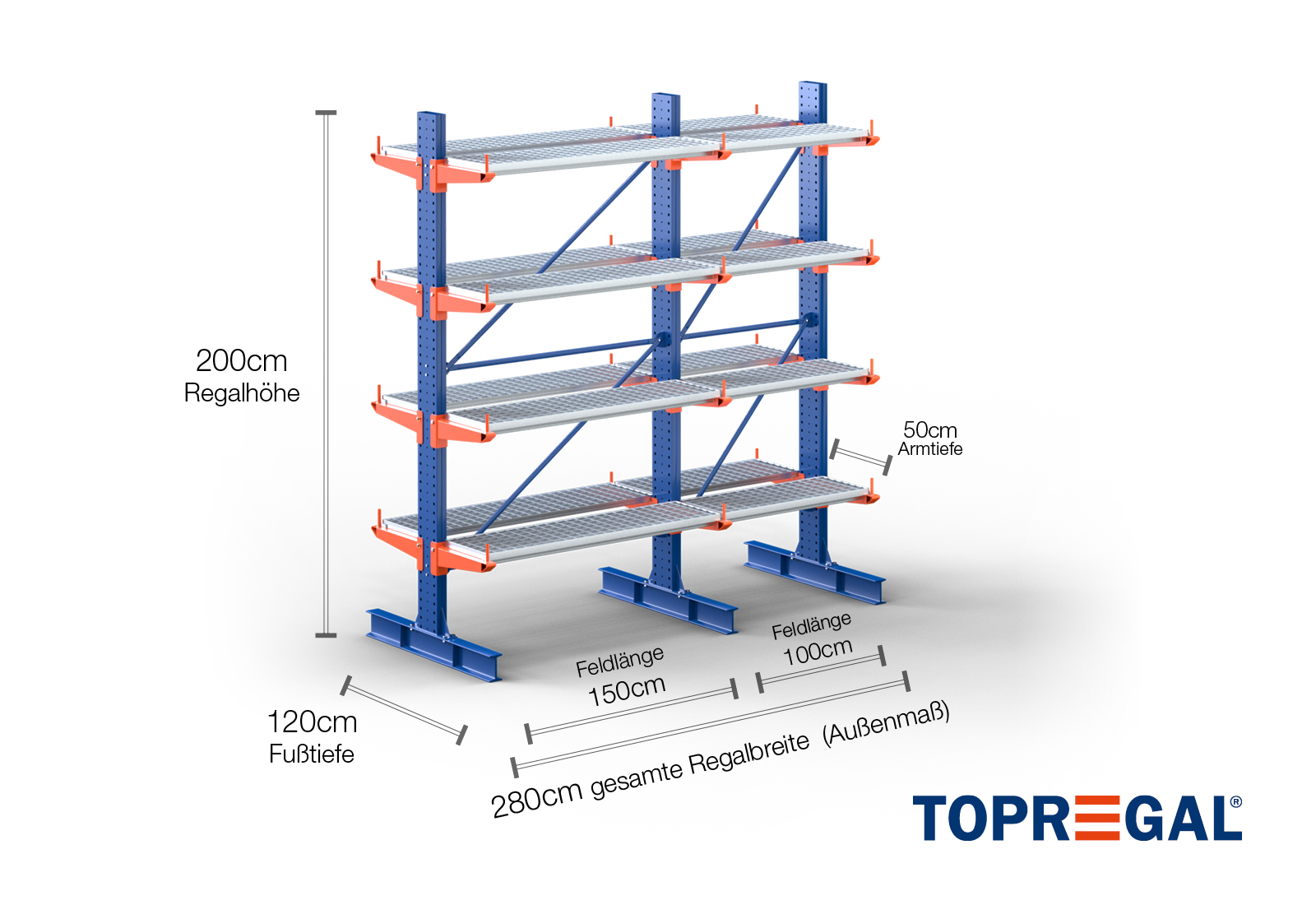 Tento konzolový regál v oboustranném provedení o šířce 2,8 m je vysoký 2 m, má celkovou hloubku 120 cm a disponuje 4 úrovněmi konzolových ramen o hloubce ramene 50 cm. Maximální nosnost na rameno činí max. 500 kg. Konzolová ramena lze individuálně zavěsit v rastru po 50 mm a zajistit pojistnými čepy a kolíky. Jako skladovací úroveň lze (v závislosti na zboží) využít také patky. Na ochranu nákladu před náhodným sklouznutím lze na konec každého konzolového ramene nasadit pojistku proti pádu. Ta je standardně součástí dodávky. Svislé zatížení je maximálně 3.000 kg.