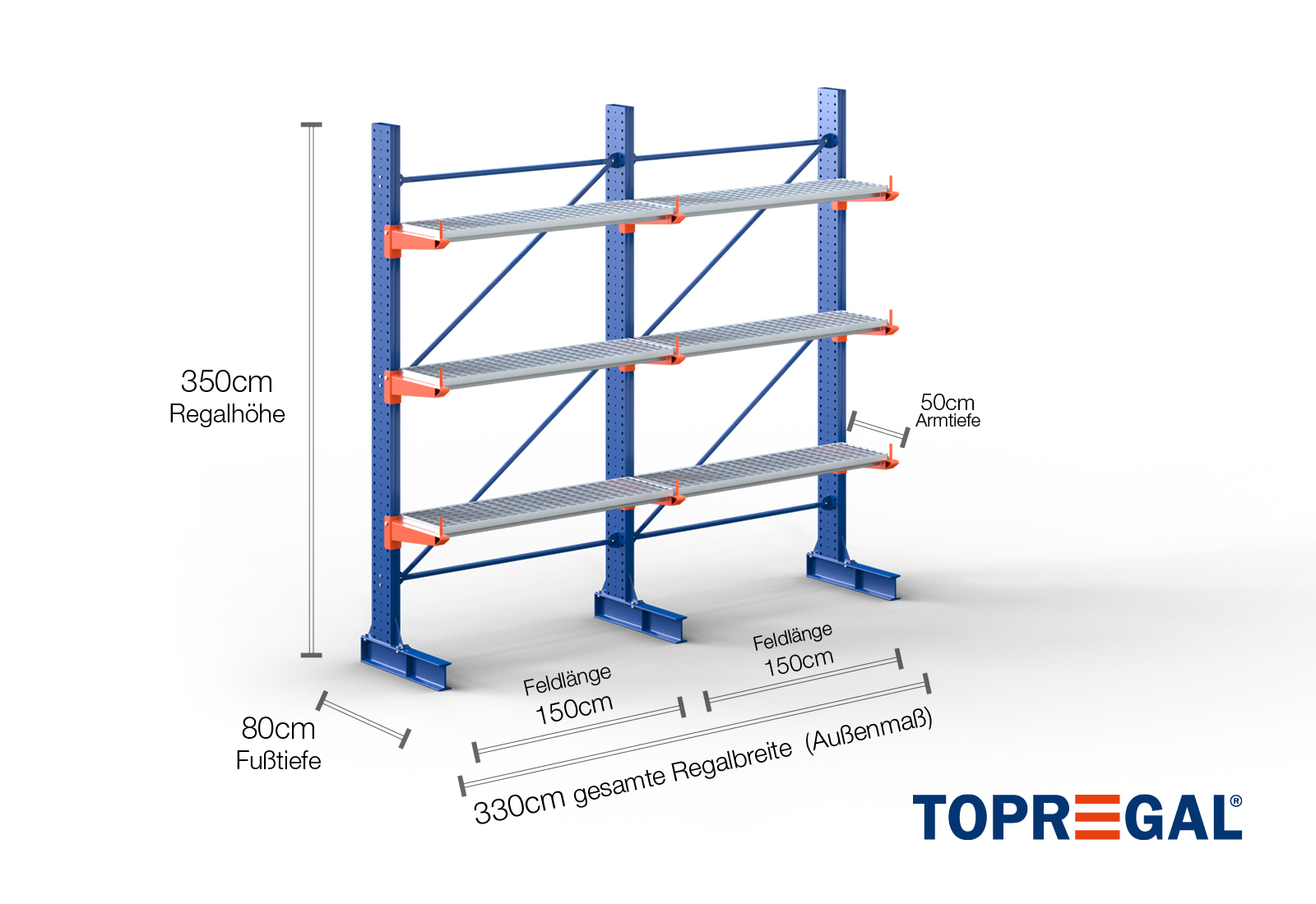 Tento konzolový regál v jednostranném provedení o šířce 3,3 m je vysoký 3,5 m, má celkovou hloubku 80 cm a disponuje 3 úrovněmi konzolových ramen o hloubce ramene 50 cm. Maximální nosnost na rameno činí max. 500 kg. Konzolová ramena lze individuálně zavěsit v rastru po 50 mm a zajistit pojistnými čepy. Jako skladovací úroveň lze (v závislosti na zboží) využít také patky. Na ochranu nákladu před náhodným sklouznutím lze na konec každého konzolového ramene nasadit pojistku proti pádu. Ta je standardně součástí dodávky.