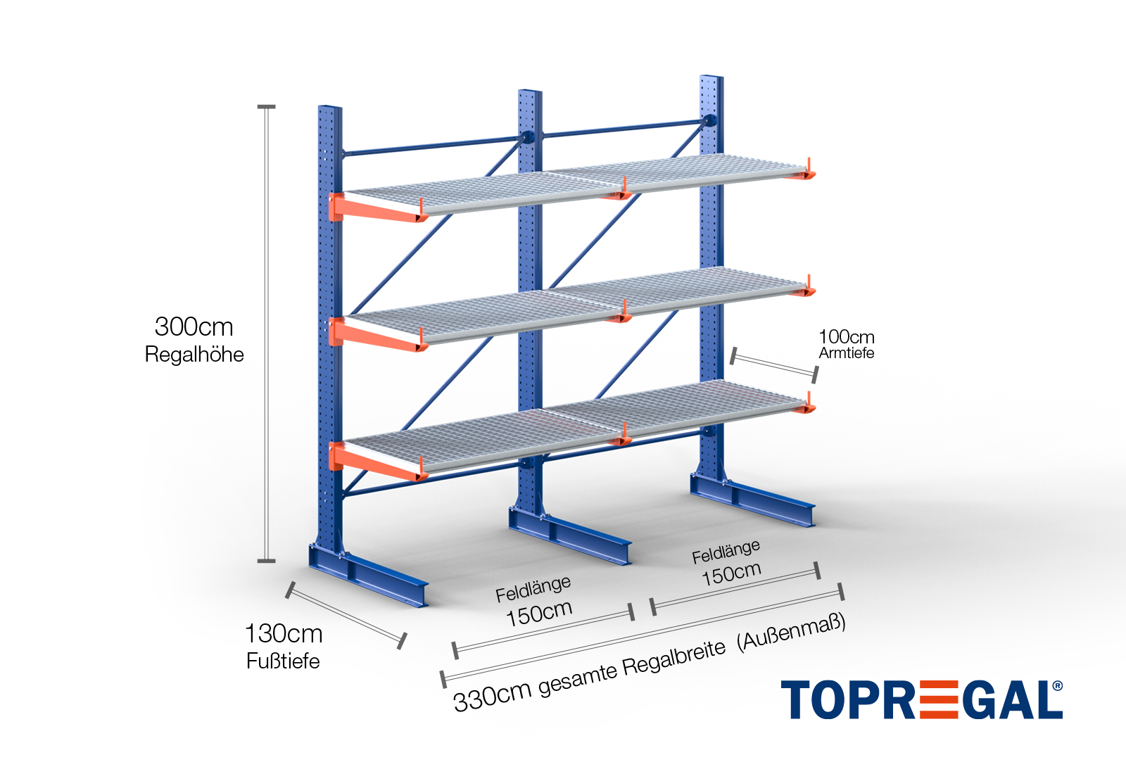 Tento konzolový regál v jednostranném provedení o šířce 3,3 m je vysoký 3 m, má celkovou hloubku 120 cm a disponuje 3 úrovněmi konzolových ramen o hloubce ramene 100 cm. Maximální nosnost na rameno činí max. 500 kg. Konzolová ramena lze individuálně zavěsit v rastru po 50 mm a zajistit pojistnými čepy. Jako skladovací úroveň lze (v závislosti na zboží) využít také patky. Na ochranu nákladu před náhodným sklouznutím lze na konec každého konzolového ramene nasadit pojistku proti pádu. Ta je standardně součástí dodávky.