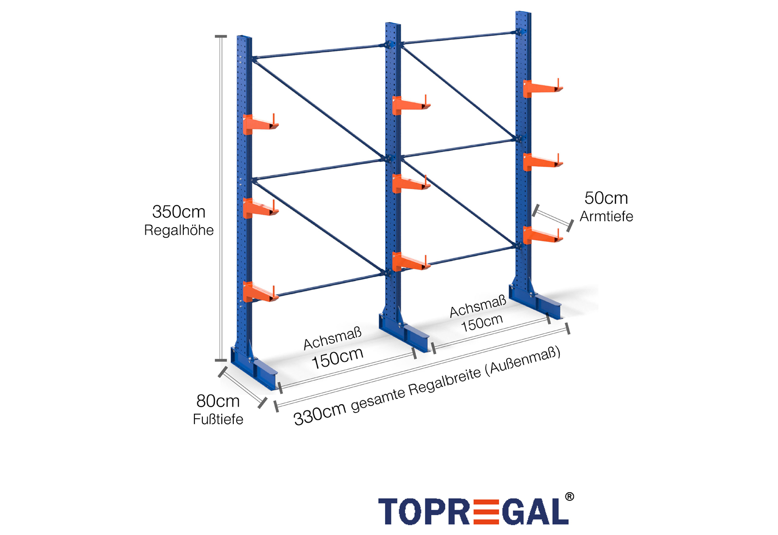 Tento konzolový regál v jednostranném provedení o šířce 3,3 m je vysoký 3,5 m, má celkovou hloubku 80 cm a disponuje 3 úrovněmi konzolových ramen o hloubce ramene 50 cm. Maximální nosnost na rameno činí max. 500 kg. Konzolová ramena lze individuálně zavěsit v rastru po 50 mm a zajistit pojistnými čepy. Jako skladovací úroveň lze (v závislosti na zboží) využít také patky. Na ochranu nákladu před náhodným sklouznutím lze na konec každého konzolového ramene nasadit pojistku proti pádu. Ta je standardně součástí dodávky.