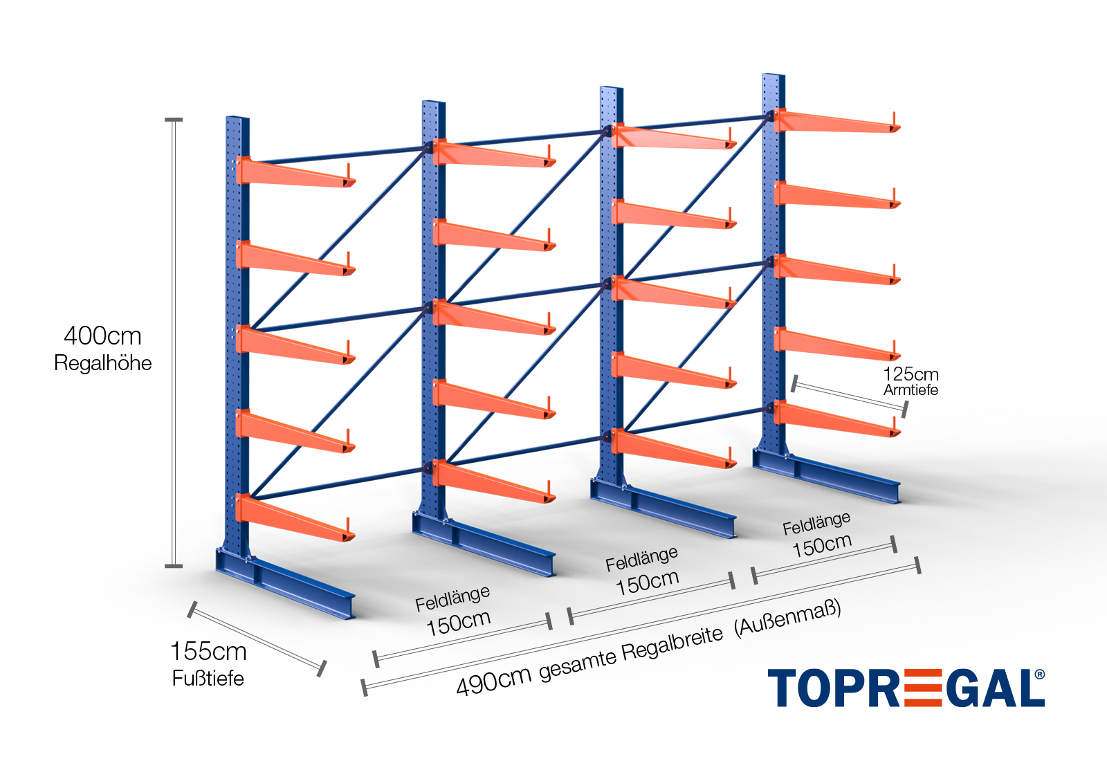 Tento konzolový regál v jednostranném provedení o šířce 4,9 m je vysoký 4 m, má celkovou hloubku 155 cm a disponuje 5 úrovněmi konzolových ramen o hloubce ramene 125 cm. Maximální nosnost na rameno činí max. 500 kg. Konzolová ramena lze individuálně zavěsit v rastru po 50 mm a zajistit pojistnými čepy. Jako skladovací úroveň lze (v závislosti na zboží) využít také patky. Na ochranu nákladu před náhodným sklouznutím lze na konec každého konzolového ramene nasadit pojistku proti pádu. Ta je standardně součástí dodávky.