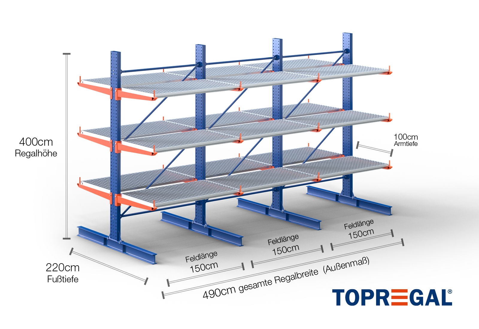Tento konzolový regál v oboustranném provedení o šířce 4,9 m je vysoký 4 m, má celkovou hloubku 220 cm a disponuje 3 úrovněmi konzolových ramen o hloubce ramene 100 cm. Maximální nosnost na rameno činí max. 500 kg. Konzolová ramena lze individuálně zavěsit v rastru po 50 mm a zajistit pojistnými čepy a kolíky. Jako skladovací úroveň lze (v závislosti na zboží) využít také patky. Na ochranu nákladu před náhodným sklouznutím lze na konec každého konzolového ramene nasadit pojistku proti pádu. Ta je standardně součástí dodávky. Svislé zatížení je maximálně 3.000 kg.