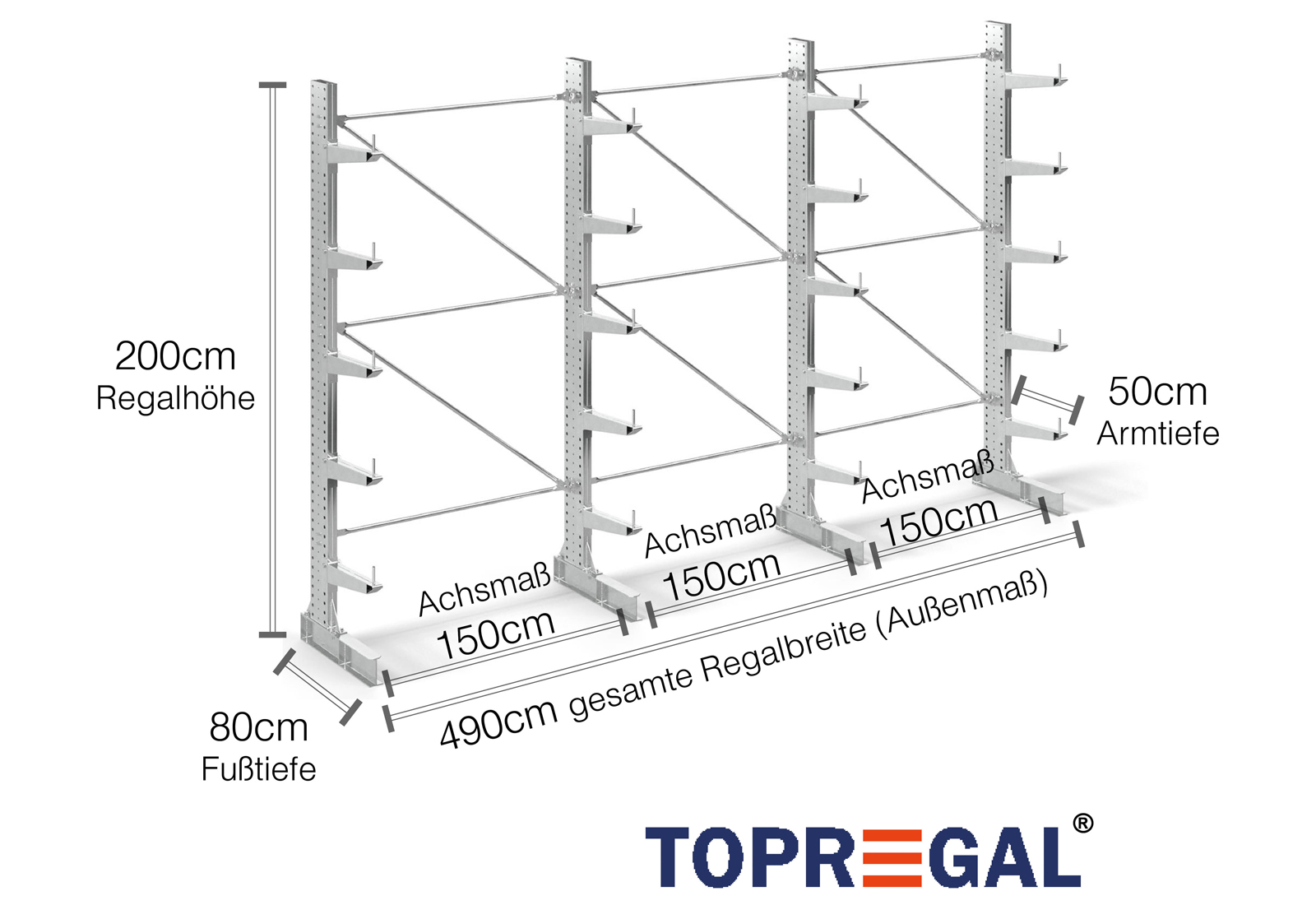 Tento konzolový regál v jednostranném provedení o šířce 4,9 m je vysoký 2 m, má celkovou hloubku 80 cm a disponuje 5 úrovněmi konzolových ramen o hloubce ramene 50 cm. Maximální nosnost na rameno činí max. 500 kg. Konzolová ramena lze individuálně zavěsit v rastru po 50 mm a zajistit pojistnými čepy. Jako skladovací úroveň lze (v závislosti na zboží) využít také patky. Na ochranu nákladu před náhodným sklouznutím lze na konec každého konzolového ramene nasadit pojistku proti pádu. Ta je standardně součástí dodávky.