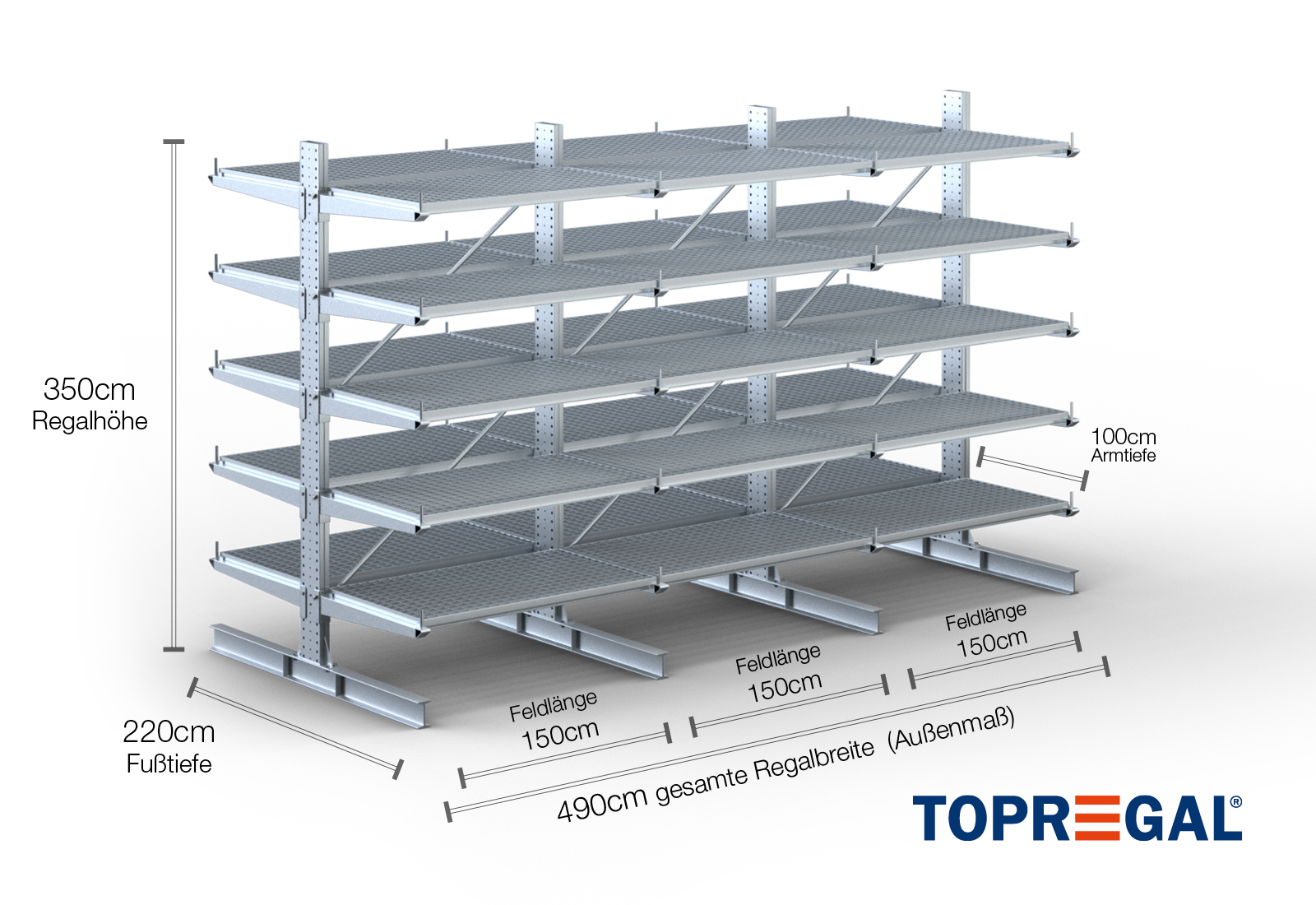Tento konzolový regál v oboustranném provedení o šířce 4,9 m je vysoký 3,5 m, má celkovou hloubku 220 cm a disponuje 5 úrovněmi konzolových ramen o hloubce ramene 100 cm. Maximální nosnost na rameno činí max. 500 kg. Konzolová ramena lze individuálně zavěsit v rastru po 50 mm a zajistit pojistnými čepy a kolíky. Jako skladovací úroveň lze (v závislosti na zboží) využít také patky. Na ochranu nákladu před náhodným sklouznutím lze na konec každého konzolového ramene nasadit pojistku proti pádu. Ta je standardně součástí dodávky. Svislé zatížení je maximálně 3.000 kg.