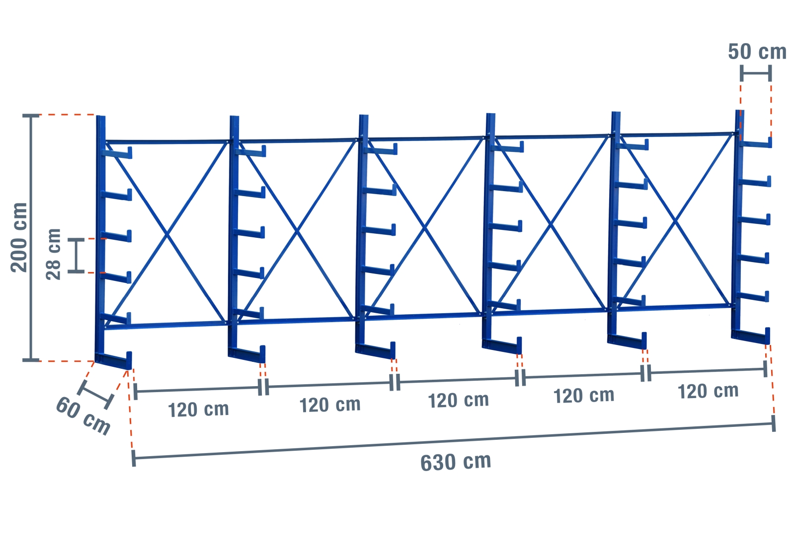 Tento zvláště robustní konzolový regál o šířce 6,3 m má výšku 2 m a 5 úrovní s hloubkou ramene 50 cm. Díky jednostrannému provedení s již navařenými konzolovými rameny můžete každý stojan zatížit maximálně 1.250 kg, přičemž každé rameno má maximální nosnost 250 kg.