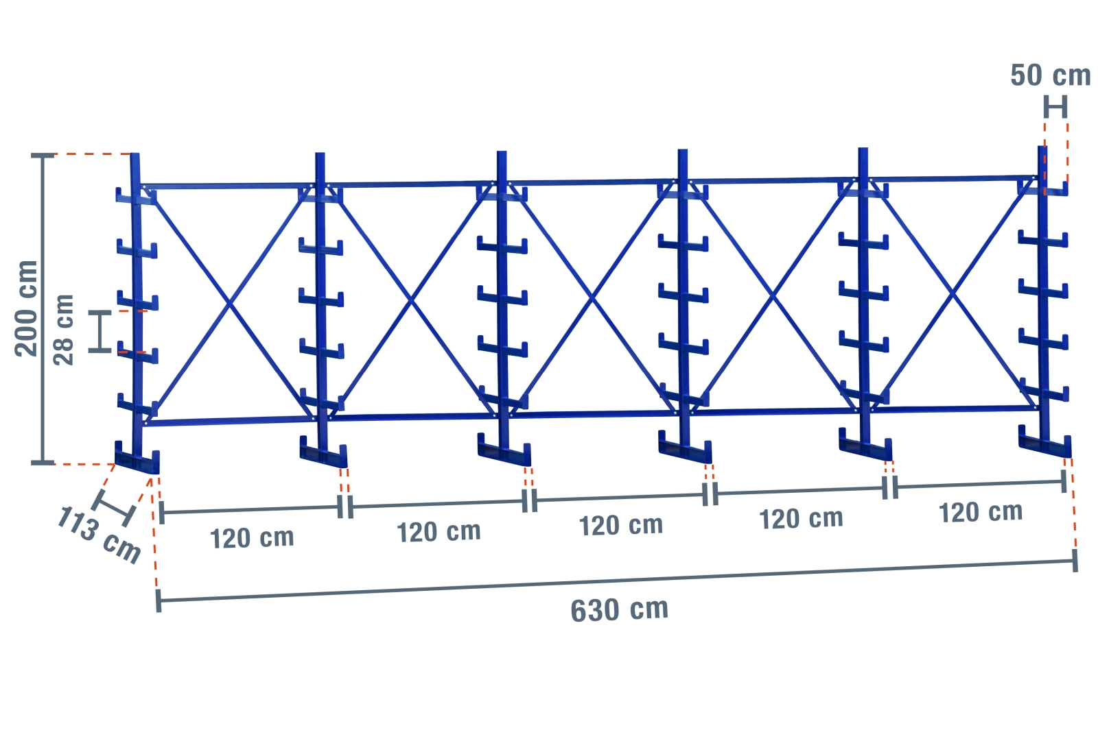 Tento zvláště robustní konzolový regál o šířce 6,3 m má výšku 2 m a 5 úrovní s hloubkou ramene 50 cm. Díky oboustrannému provedení s již navařenými konzolovými rameny můžete každý stojan zatížit maximálně 2.500 kg, přičemž každé rameno má maximální nosnost 250 kg.