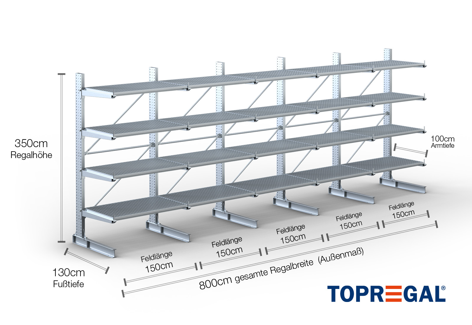 Tento konzolový regál v jednostranném provedení o šířce 8 m je vysoký 3,5 m, má celkovou hloubku 130 cm a disponuje 4 úrovněmi konzolových ramen o hloubce ramene 100 cm. Maximální nosnost na rameno činí max. 500 kg. Konzolová ramena lze individuálně zavěsit v rastru po 50 mm a zajistit pojistnými čepy. Jako skladovací úroveň lze (v závislosti na zboží) využít také patky. Na ochranu nákladu před náhodným sklouznutím lze na konec každého konzolového ramene nasadit pojistku proti pádu. Ta je standardně součástí dodávky.