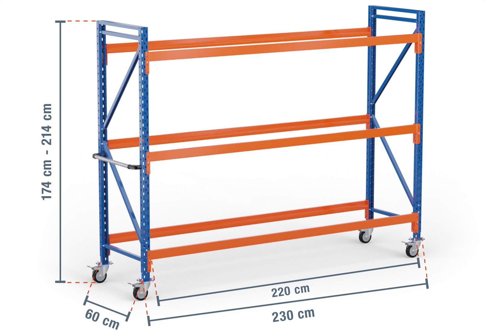 Tento kompletně nakonfigurovaný pojízdný regál s policemi na pneumatiky bez úložné plochy slouží pro praktickou přepravu pneumatik, ráfků apod. Celková šířka tohoto praktického pojízdného regálu je okolo 2,3 m, přičemž efektivní úložná plocha (použitelný vnitřní rozměr) je o 10 cm kratší. Tento regál má 3 úrovní, přičemž traverzu 110 cm lze osadit 6 a traverzu 220 cm až 12 pneumatikami nebo ráfky.