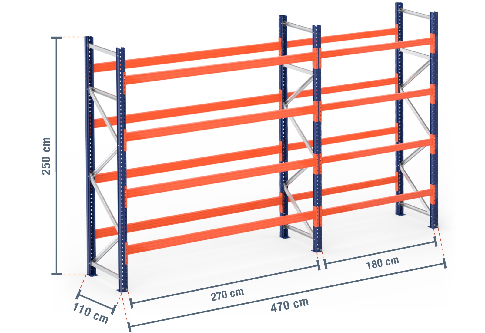 4,7 m paletový regál PR9000 / hloubka 110 cm / výška 2,5 m / 4 úrovní pro 25 europalety
