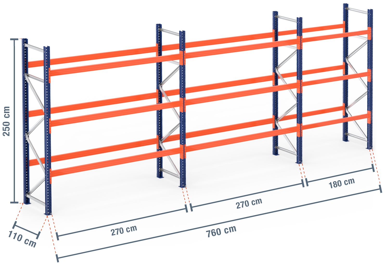 7,6 m paletový regál PR9000 / hloubka 110 cm / výška 2,5 m / 3 úrovní pro 32 europalety