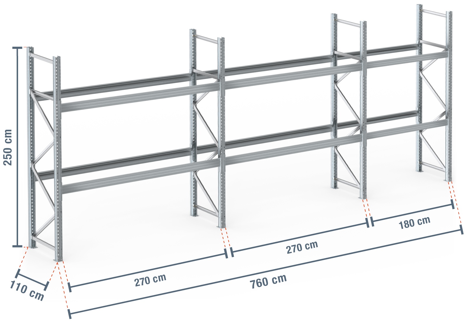 7,6 m paletový regál PR9000F žárově pozinkovaný / hloubka 110 cm / výška 2,5 m / 2 úrovní pro 24 europalet