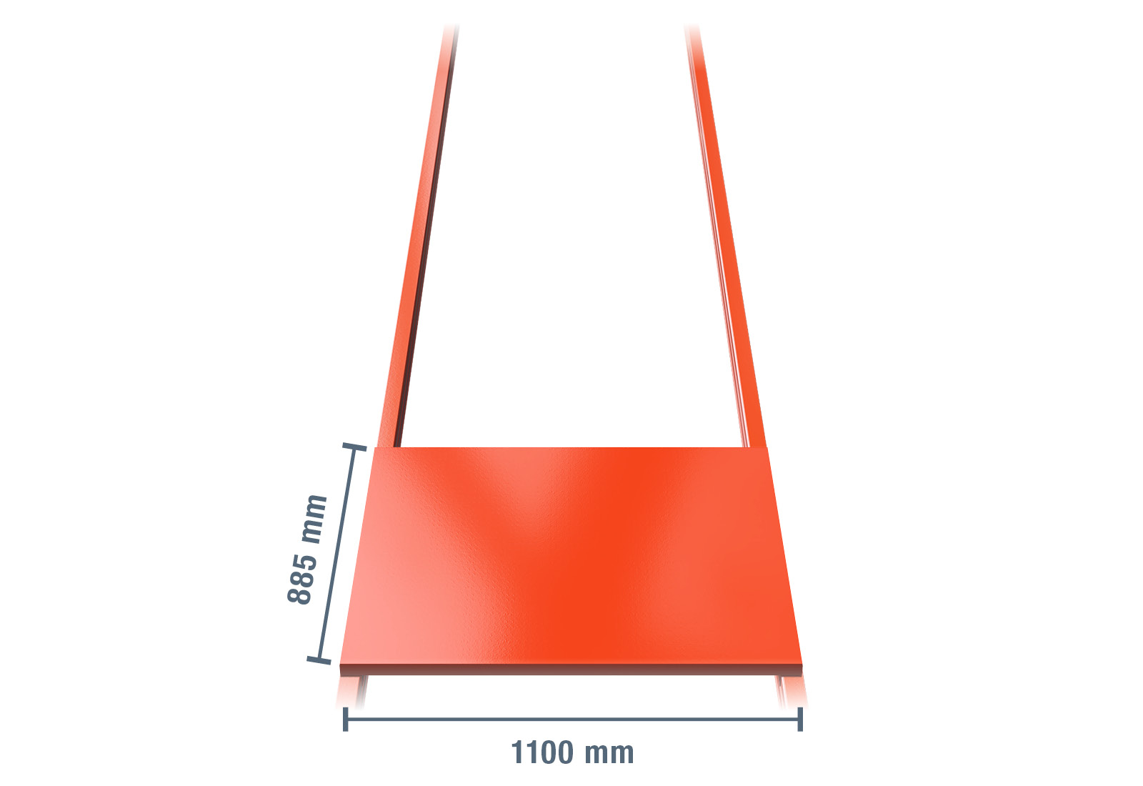 Ocelová úložná plocha pro paletový regál se skládá z 1 modulů o hloubce 1.100 mm a šířce 885 mm. Na šířku tak dosahuje celkově 885 mm. Každý modul unese maximální zatížení 1.000 kg.