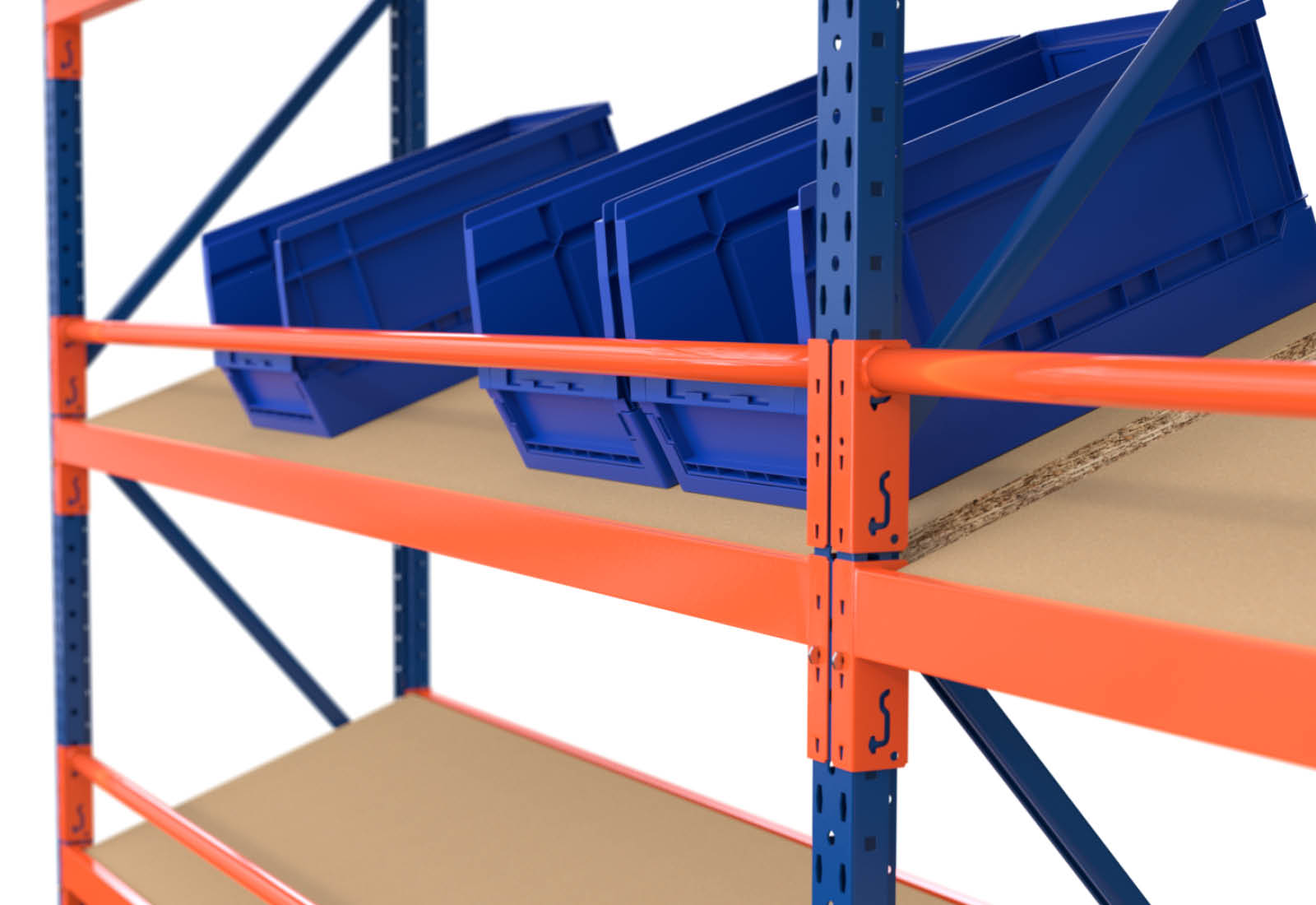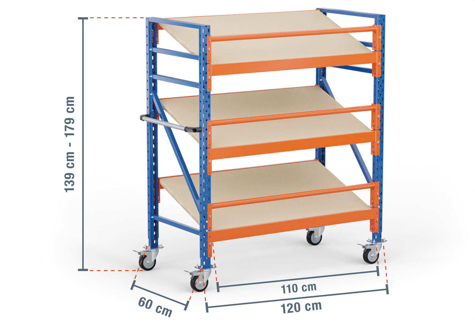 Šikmá police umožňuje optimální vyjmutí balíků a drobných dílů z plastových boxů i úložných boxů. Šikmé police jsou nakloněny pod úhlem 20 stupňů, což výrazně usnadňuje viditelnost i vyjímání. To šetří čas při vychystávání a zvyšuje kapacitu příjmu a výdeje zboží. Vlastností regálu je snadná přeprava, což otevírá různé možnosti v logistice: Vaše balicí, montážní nebo příjmová stanice je tak nezávislá na skutečném umístění a v případě potřeby ji lze flexibilně přemístit. Drobné díly, jako jsou šrouby nebo matice, lze přemístit z bodu A do bodu B stejně snadno jako zboží určené k vychystání.