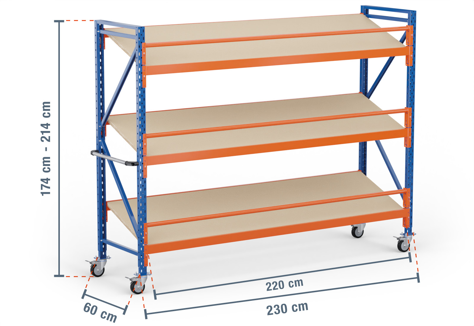 Vnější rozměr tohoto pojízdného šikmého regálu činí 2,3 m, přičemž užitná úložná plocha, tzv. vnitřní rozměr, je o 10 cm kratší. Maximální nosnost regálové police činí 300 kg a nosnost pole (maximální zatížení mezi dvěma regálovými stojany s rovnoměrným rozložením hmotnosti) je okolo 500 kg.