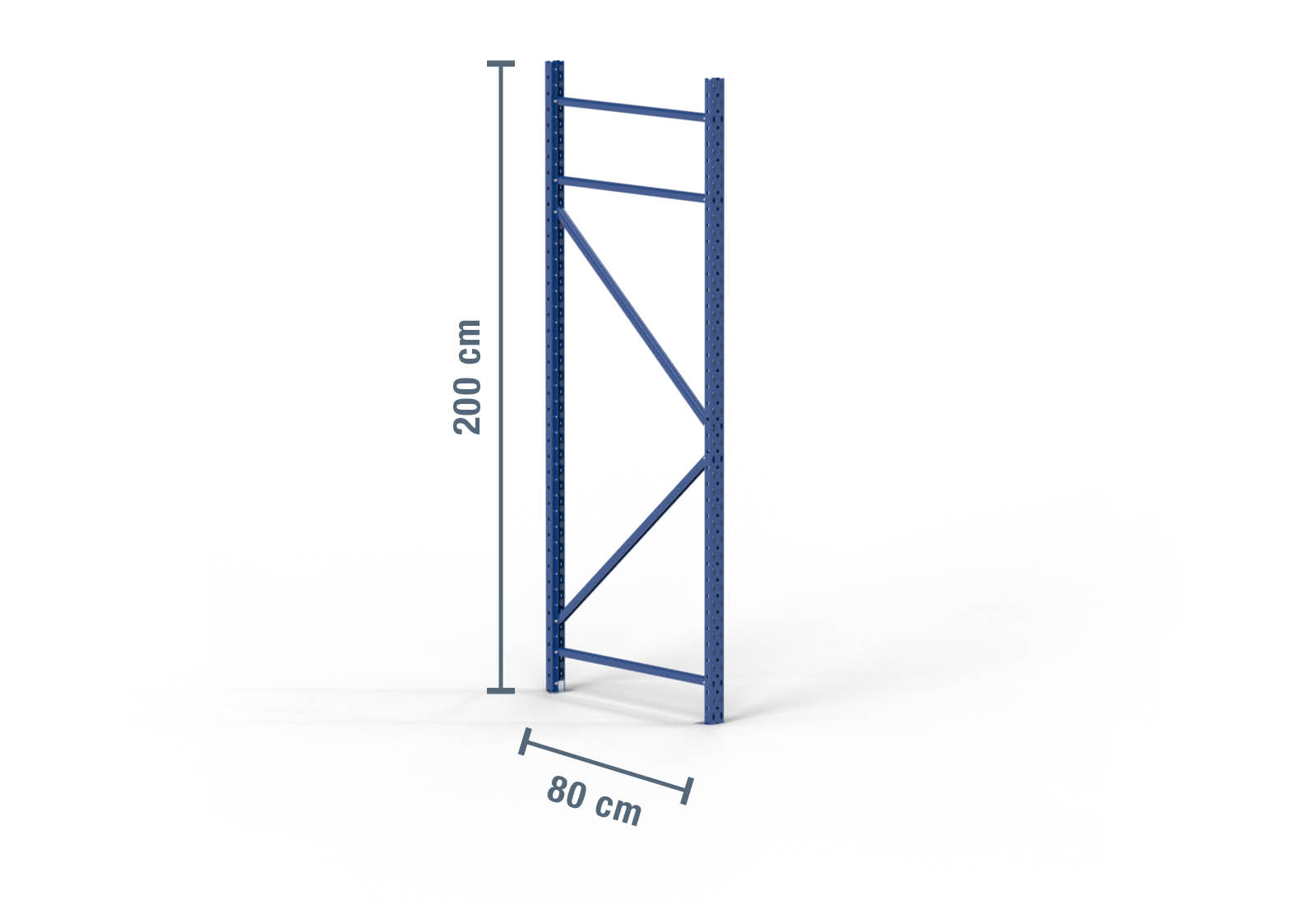 Stojan skladovacího regálu z oceli válcované za studena o výšce 2 m a hloubce 80 cm. Nosnost pole (max. zatížení mezi dvěma stojany skladovacích regálů) je 2.000 kg. Regálový stojan chrání před korozí modrý práškový lak. Pomocí kotevních čepů M8 x 55 mm je pevně upevněn v podlaze a vytváří stabilitu pro celý skladovací regál.