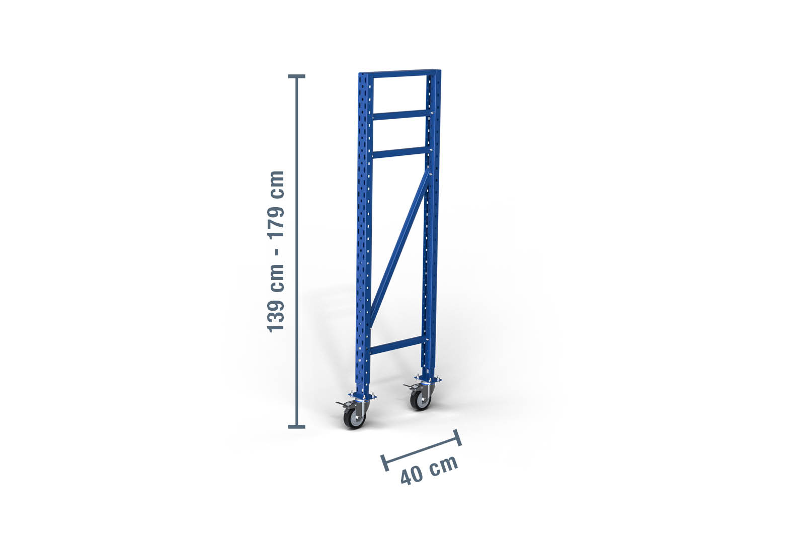 - 1 x 1.390 - 1.790 mm stojan / výškově nastavitelný / pojízdný pro skladovací regál LR2000 / hloubka 40 cm