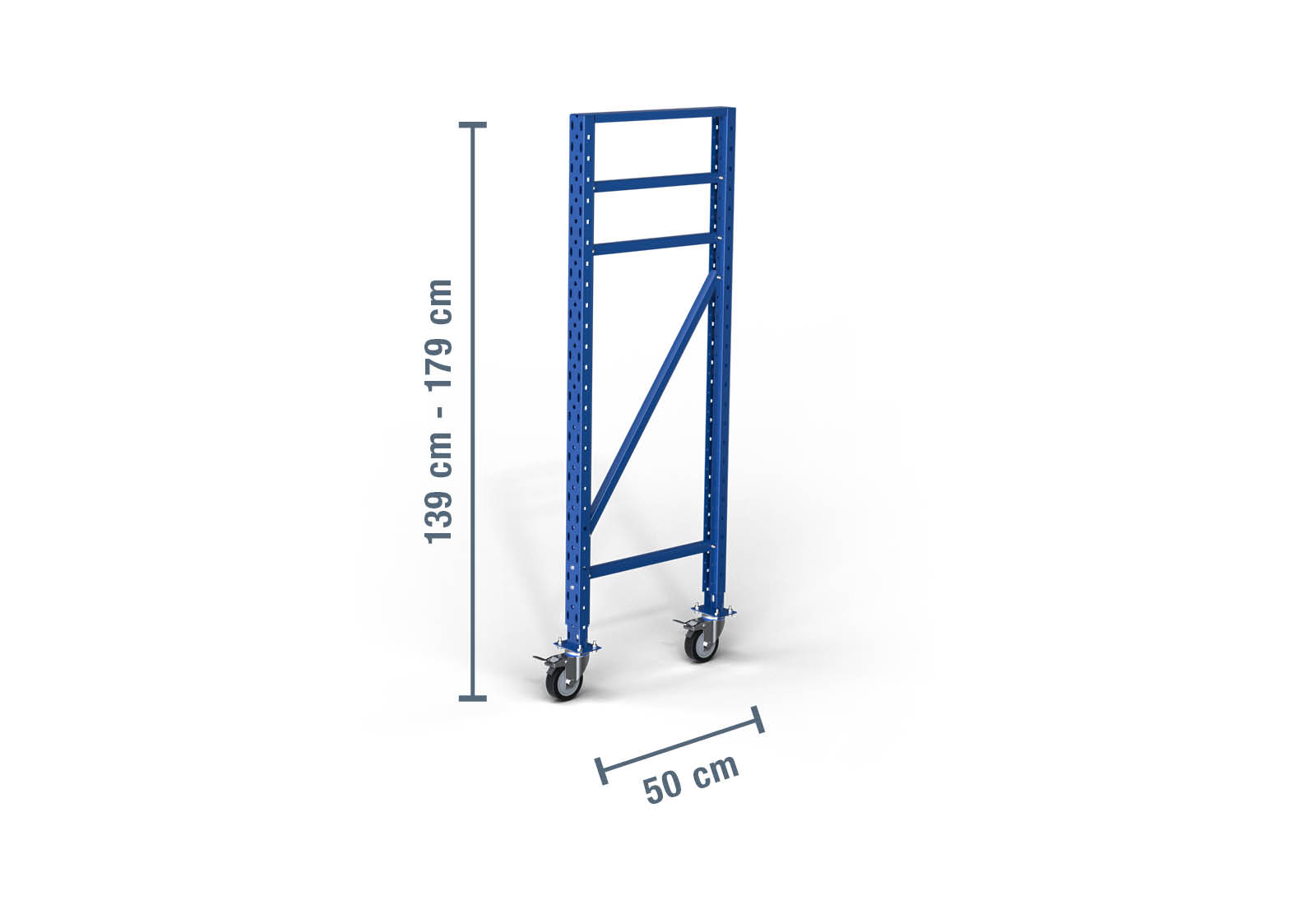 - 1 x 1.390 - 1.790 mm stojan / výškově nastavitelný / pojízdný pro skladovací regál LR2000 / hloubka 50 cm