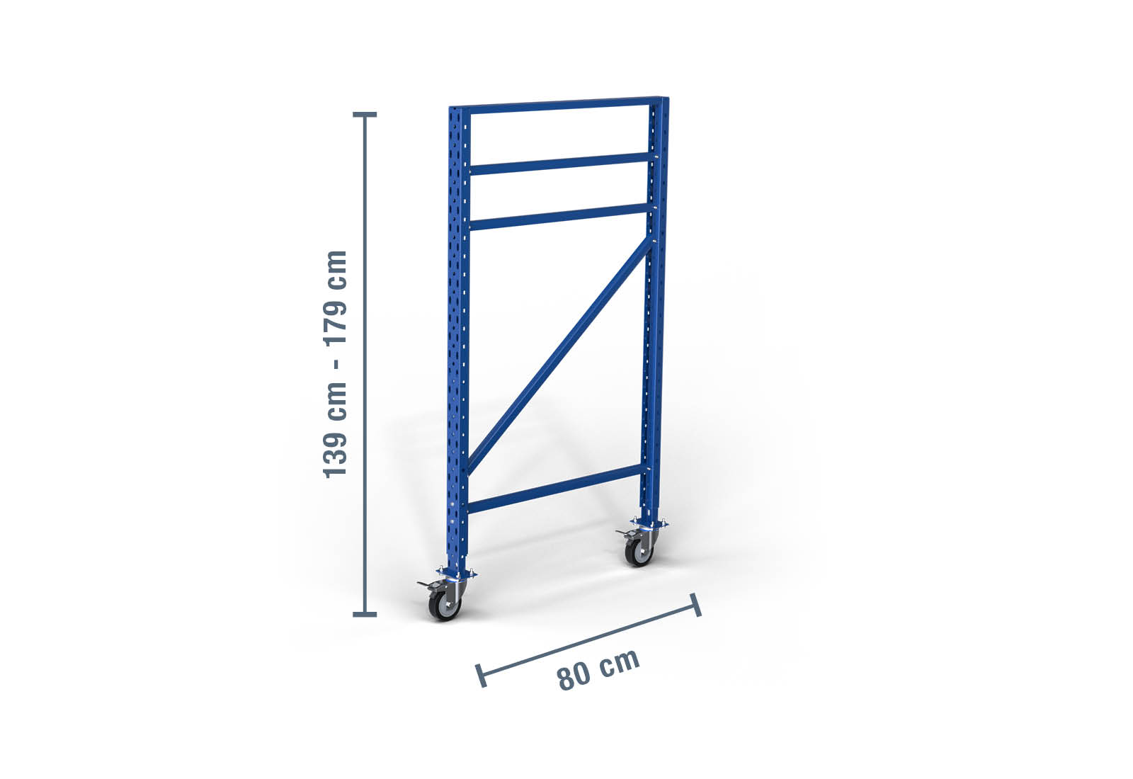 - 1 x 1.390 - 1.790 mm stojan / výškově nastavitelný / pojízdný pro skladovací regál LR2000 / hloubka 80 cm