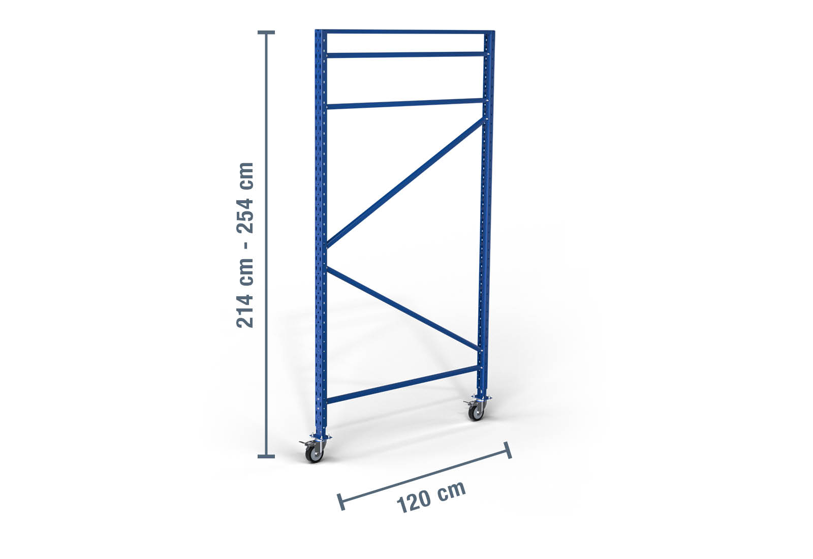 - 1 x 2.140 - 2.540 mm stojan / výškově nastavitelný / pojízdný pro skladovací regál LR2000 / hloubka 120 cm