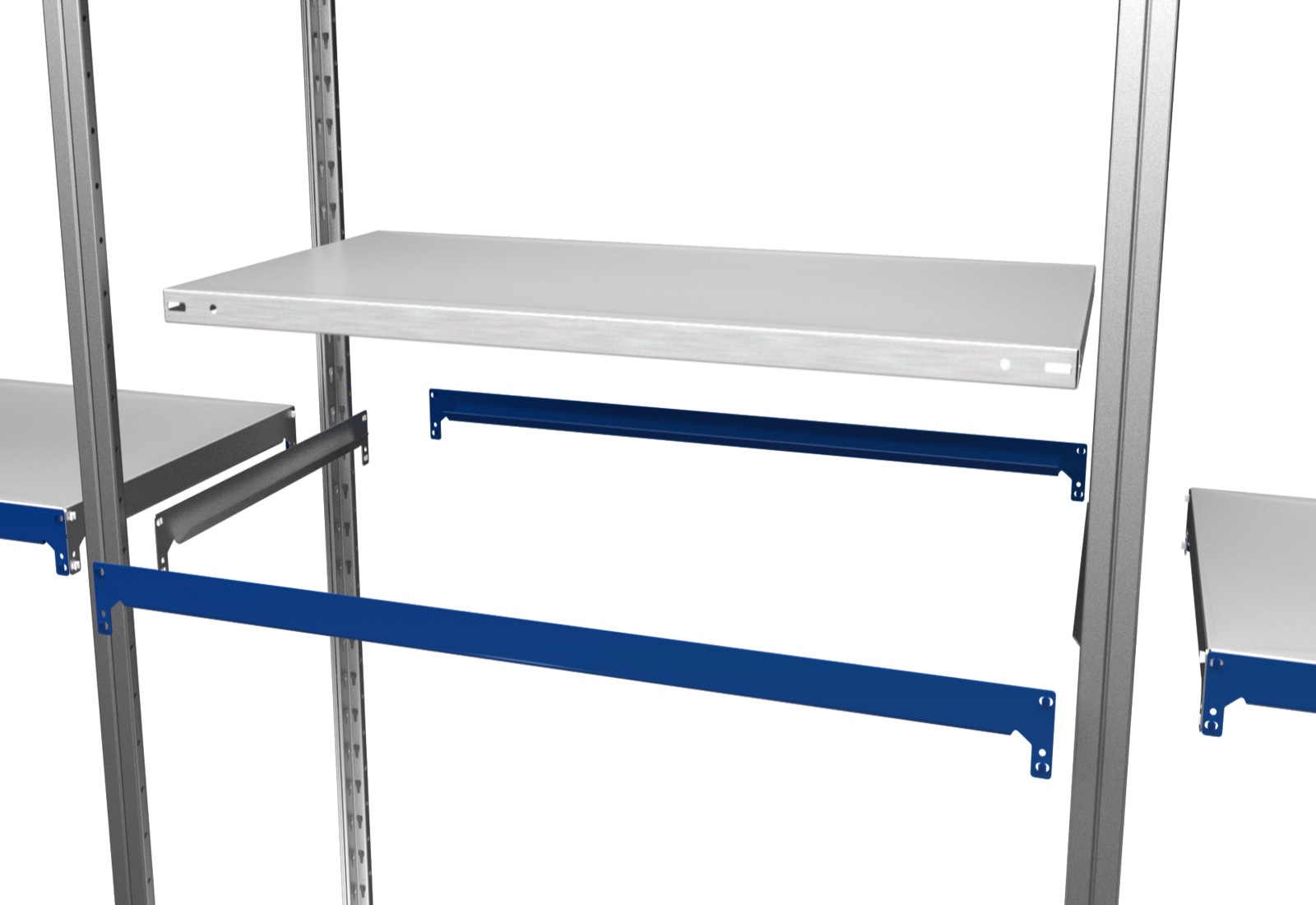 Traverzy slouží u tohoto typu regálu jako držák úložných ploch. Integrovaný schůdek umožňuje snadné vkládání polic. Ty mají standardní délku 100 cm a perfektně zapadají do přihrádek policového regálu. Tak je tento regál se svými 3 úrovněmi sestaven snadno a rychle.