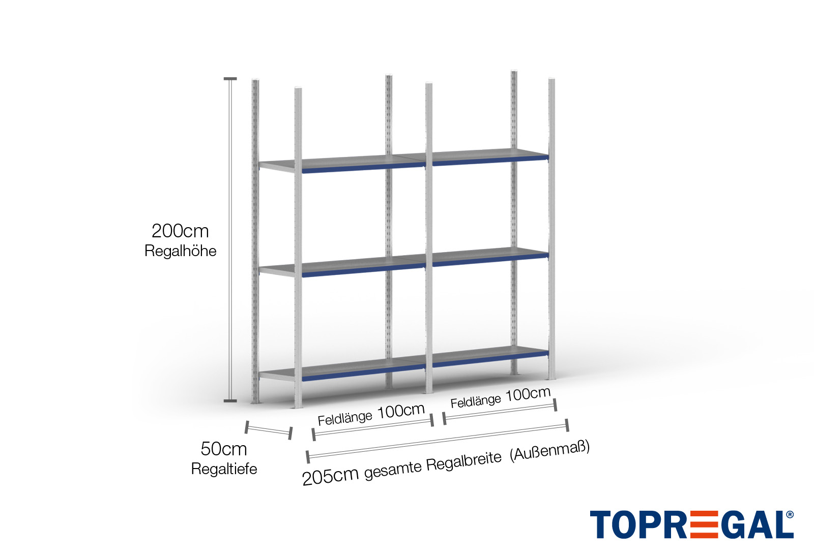 2 m policový regál FB200 / hloubka 50 cm / výška 2 m / 3 úrovní / úložná plocha ocel / nosnost police 200 kg