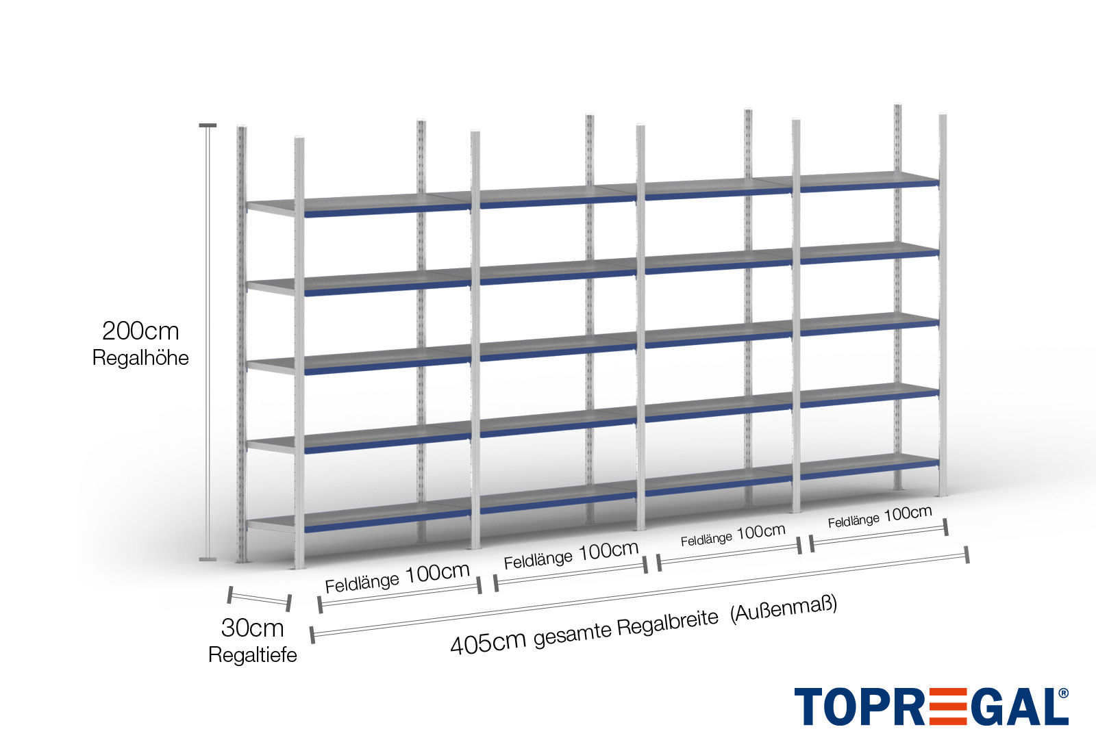 4 m policový regál FB200 / hloubka 30 cm / výška 2 m / 5 úrovní / úložná plocha ocel / nosnost police 200 kg
