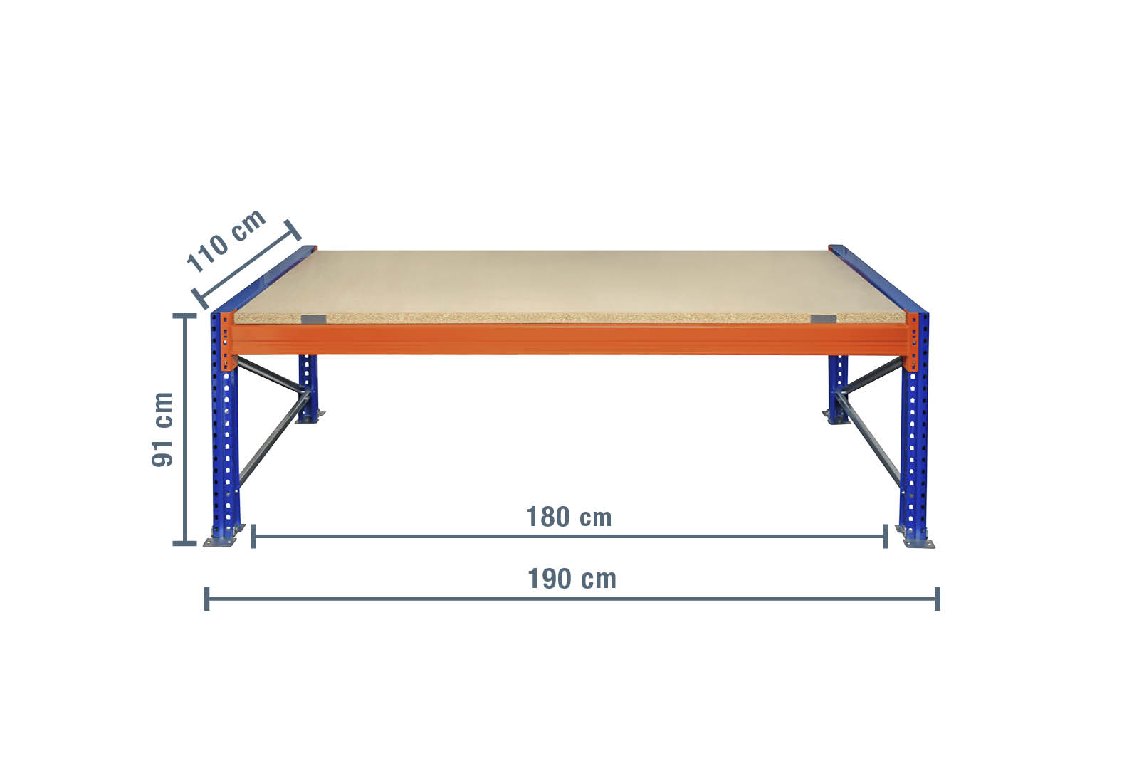 Tento balicí stůl o rozměrech 1,9 m x 110 cm x 0,91 m je vybaven dřevěnými policemi pro paletový regál 1 ze surové dřevotřískové desky. To umožňuje skladování a manipulaci se suchým zbožím. Dřevěný regál lze pomocí přiložených Z-plechů bezpečně položit na oranžově lakované traverzy. Tato konstrukce zabraňuje sklouznutí a vypadnutí regálové police a slouží k zajištění bezpečnosti práce. Jednotlivé úrovně lze zavěsit individuálně v rastru po 50 mm. Využitelná úložná plocha tohoto balicího stolu je 180 cm.