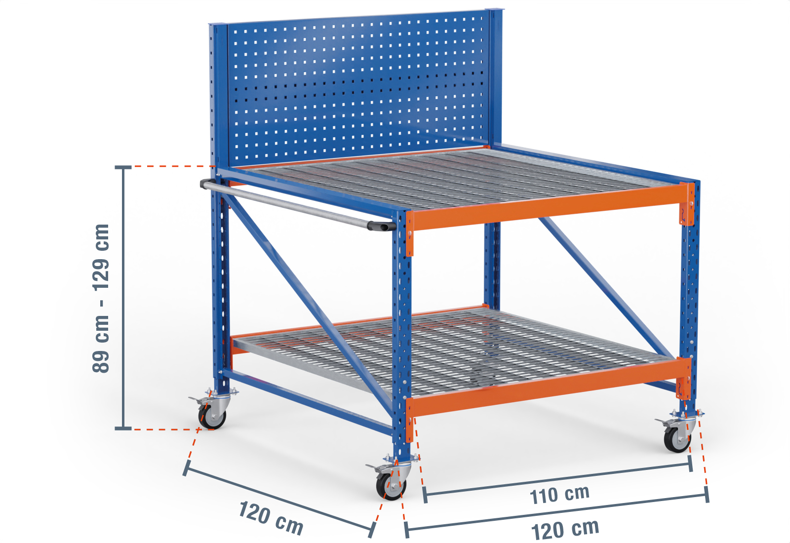 1,2 m pracovní stůl pojízdný MFW1000-AT / hloubka 120 cm / výška 890 - 1.290 mm / 2 úrovní / úložná plocha mřížka / perforovaná zadní stěna