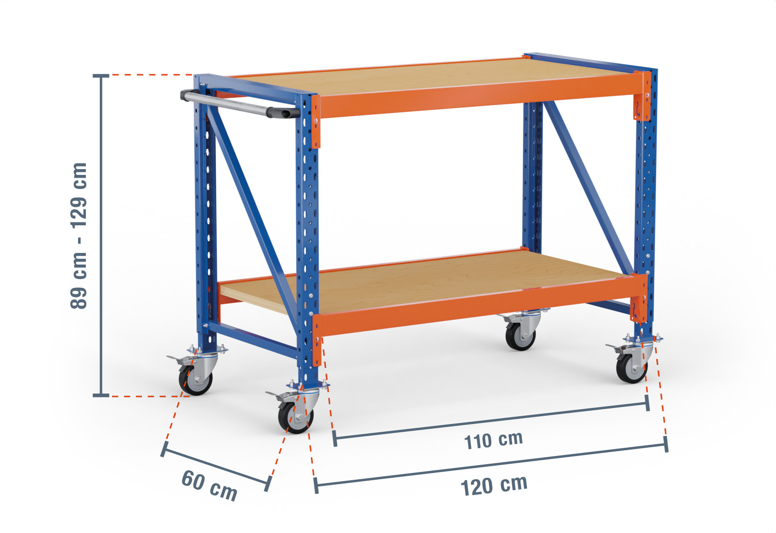 1,2 m pracovní stůl pojízdný MFW1000-AT / hloubka 60 cm / výška 890 - 1.290 mm / 2 úrovní / úložná plocha překližka