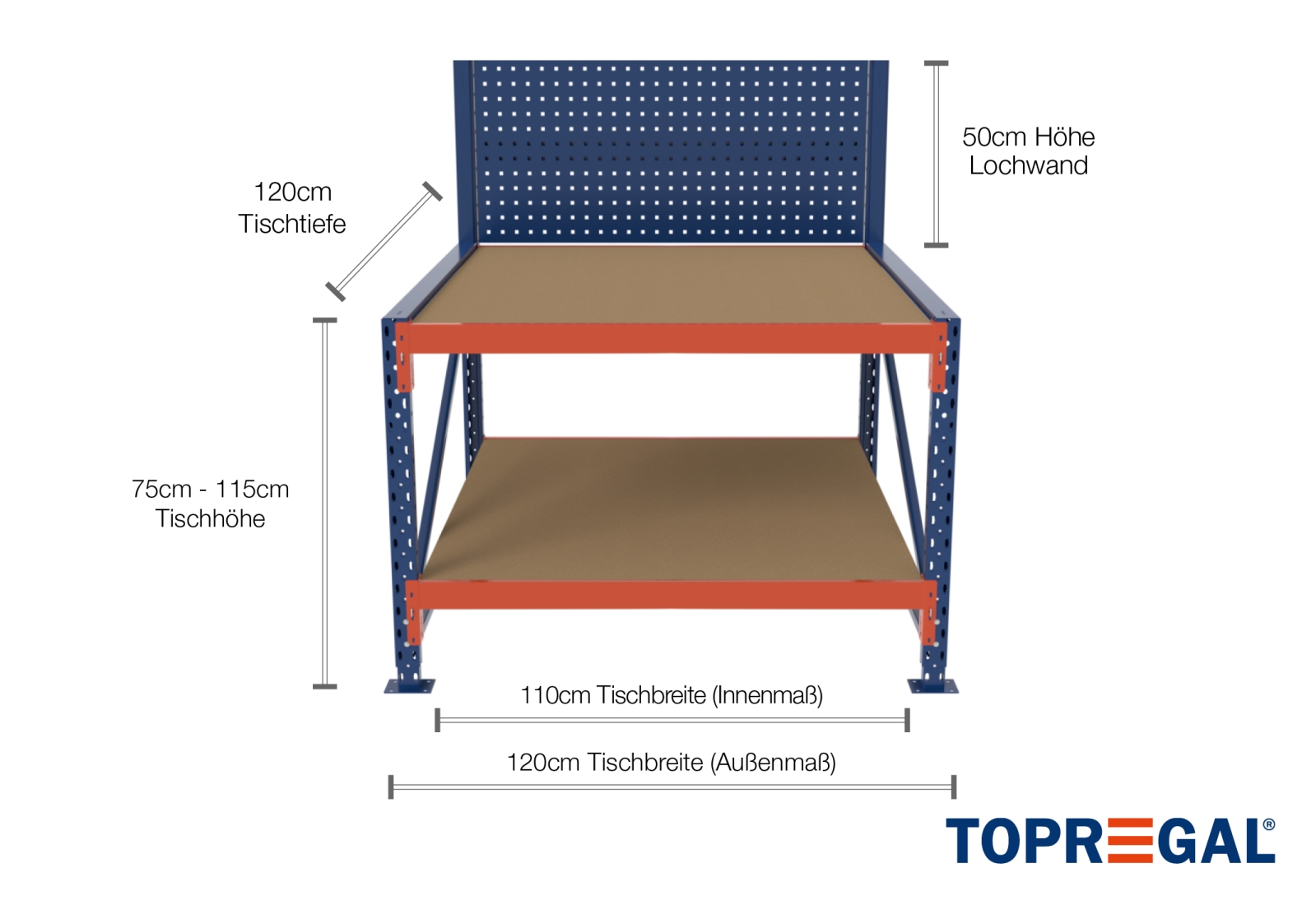 Tento pracovní stůl je vybavený 2 regálovými policemi ze dřeva, které jsou ze surové dřevotřískové desky o tloušťce 25 mm. Díky nízké hmotnosti regálové úložné plochy je montáž pracovního stolu zvláště snadná. Díky speciální konstrukci našich stupňovitých traverz se dřevěné police samy zafixují a zajistí proti sklouznutí a vypadnutí. Oranžově lakované traverzy lze díky zásuvné konstrukci individuálně zavěsit v rastru po 50 mm. Také výška celého stolu se může změnit až o 40 cm. To umožňuje navrhnout pracovní stůl podle vašich představ.