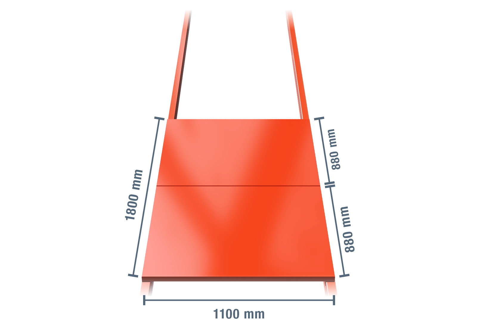 Ocelová úložná plocha pro paletový regál se skládá z 2 modulů o hloubce 1.100 mm a šířce 885 mm. Na šířku tak dosahuje celkově 1.800 mm. Každý modul unese maximální zatížení 1.000 kg.