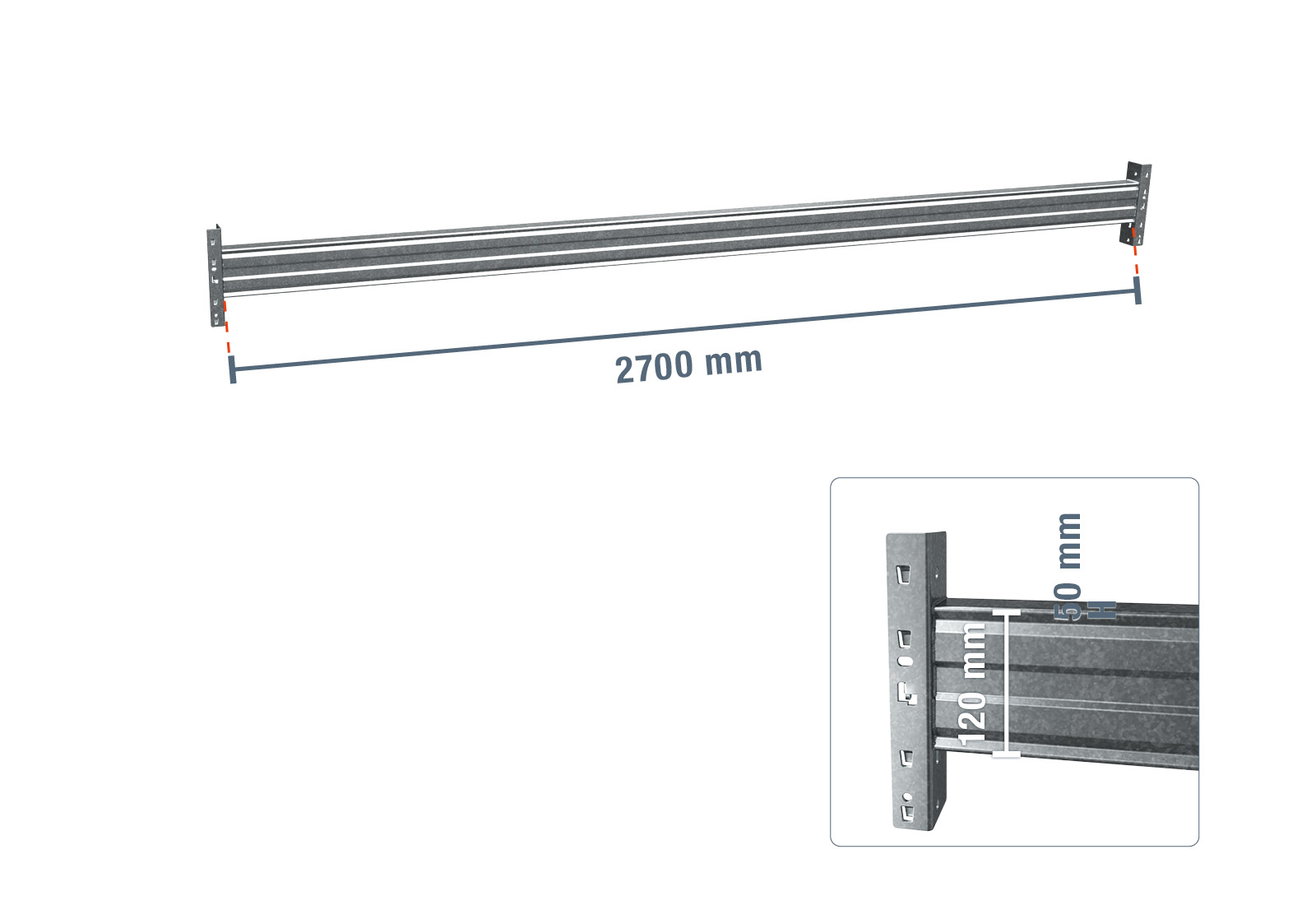 - 1 x 270 cm žárově pozinkovaná samostatná traverza pro paletový regál PR9000F / nosnost police 3.000 kg