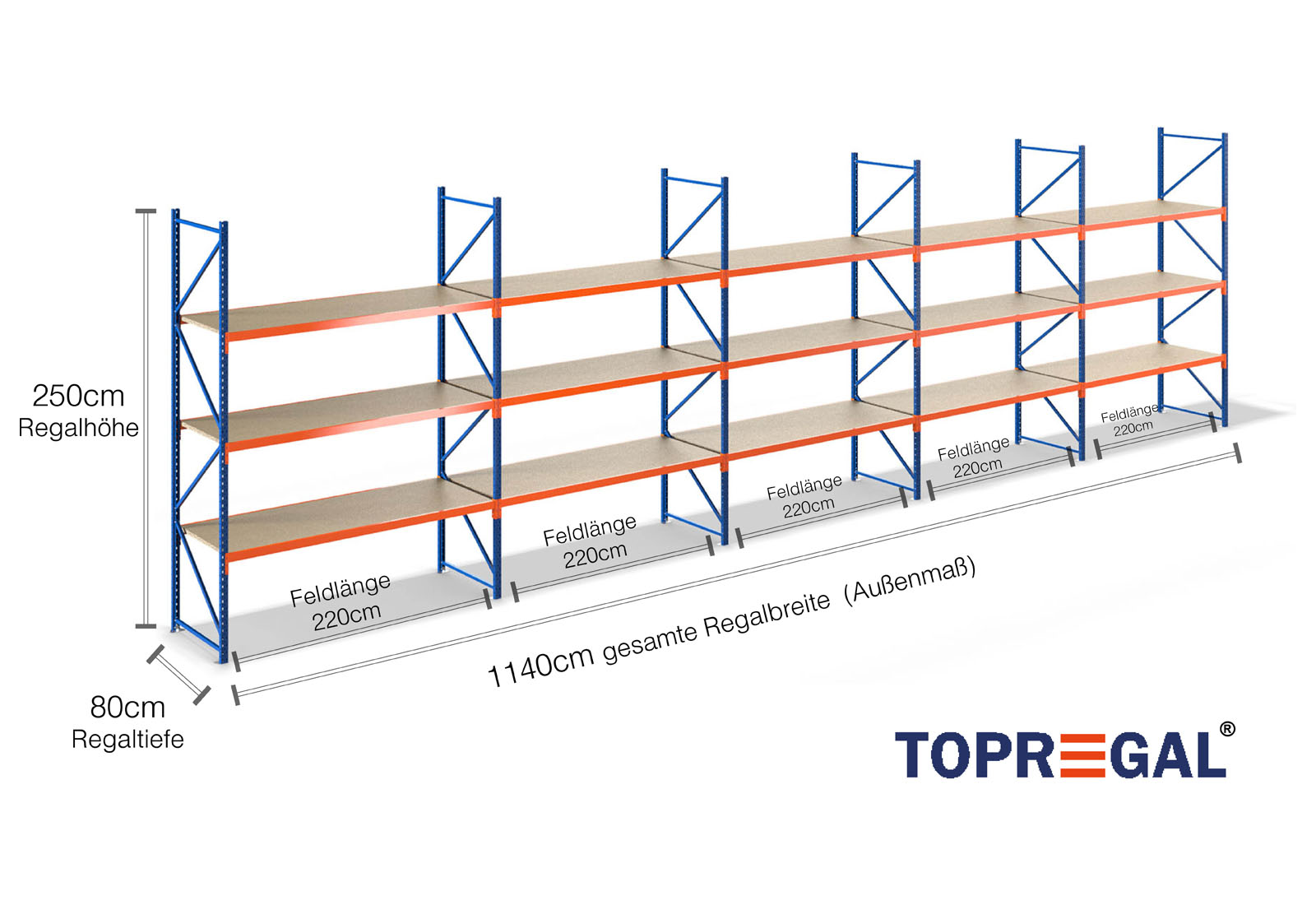 Tento skladovací regál vyniká svou výškou 2,5 m, je 80 cm hluboký a má šířku 11,4 m. Každá z 3 úrovní poskytuje maximální nosnost 500 kg, přičemž se nesmí překročit maximální zatížení mezi dvěma stojany (nosnost pole) 2.000 kg. Tyto údaje se vždy vztahují na rovnoměrné celkové zatížení regálů. Montáž probíhá díky zásuvnému systému bez problému a rychle. Pro regály se širokým rozpětím TOPREGAL je kromě toho k dispozici rozsáhlý výběr jednotlivých dílů a příslušenství, jako např. regálové stojany, traverzy, magnetické pásky a plastové boxy.