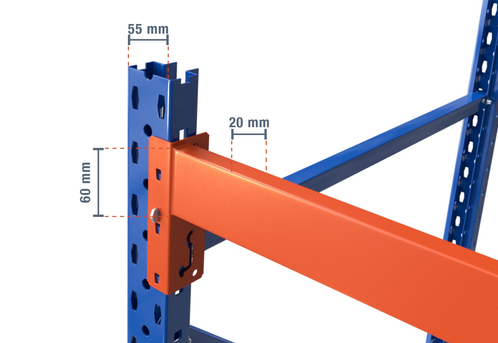 Montáž probíhá jen v několika krocích. Díky jednoduchému zásuvnému systému můžete traverzy zavěsit individuálně v rastru po 50 mm a zafixovat je pojistnými kolíky. Modulární stavebnicový systém našich skladovacích regálů navíc zajišťuje možnost regál kdykoliv rozšířit a navýšit počet úrovní. Tento typ regálu přitom vyniká atraktivním vzhledem, oranžovými traverzami a modrými stojany skladovacích regálů, a také stabilní konstrukcí s dlouhou životností.