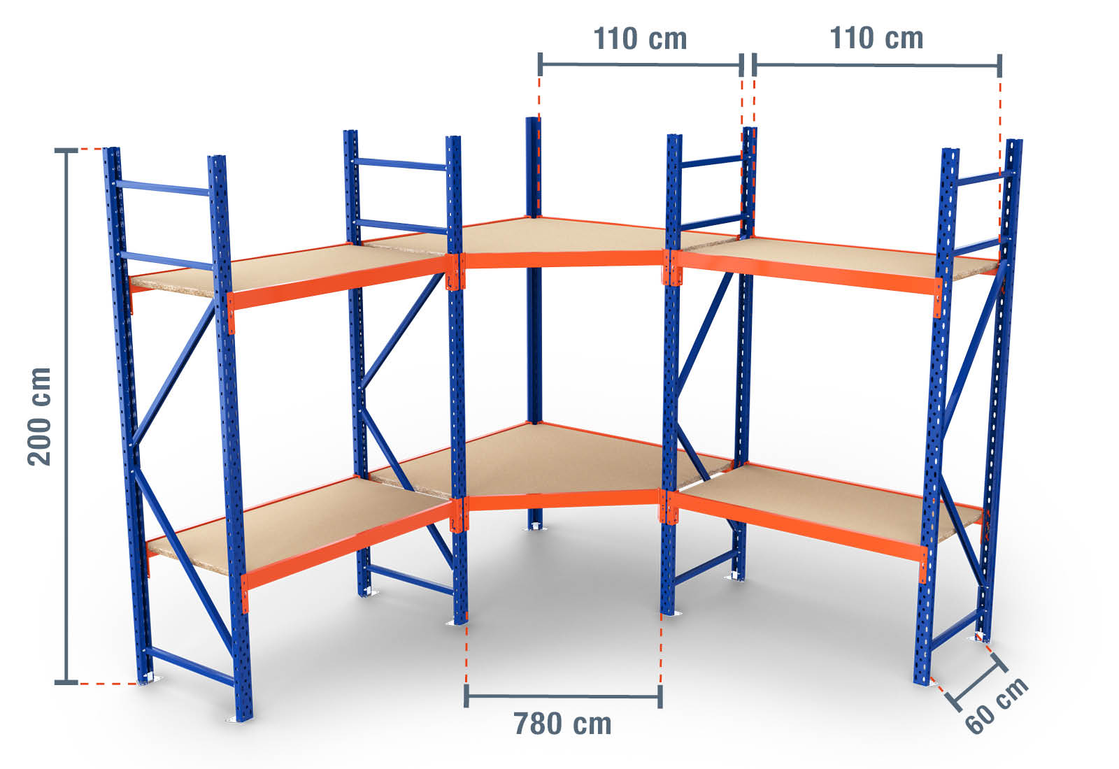 2.300 mm x 2.300 mm rohový regál / skladovací regál LR2000 / hloubka 60 cm / výška 2 m / 2 úrovní / úložná plocha dřevo