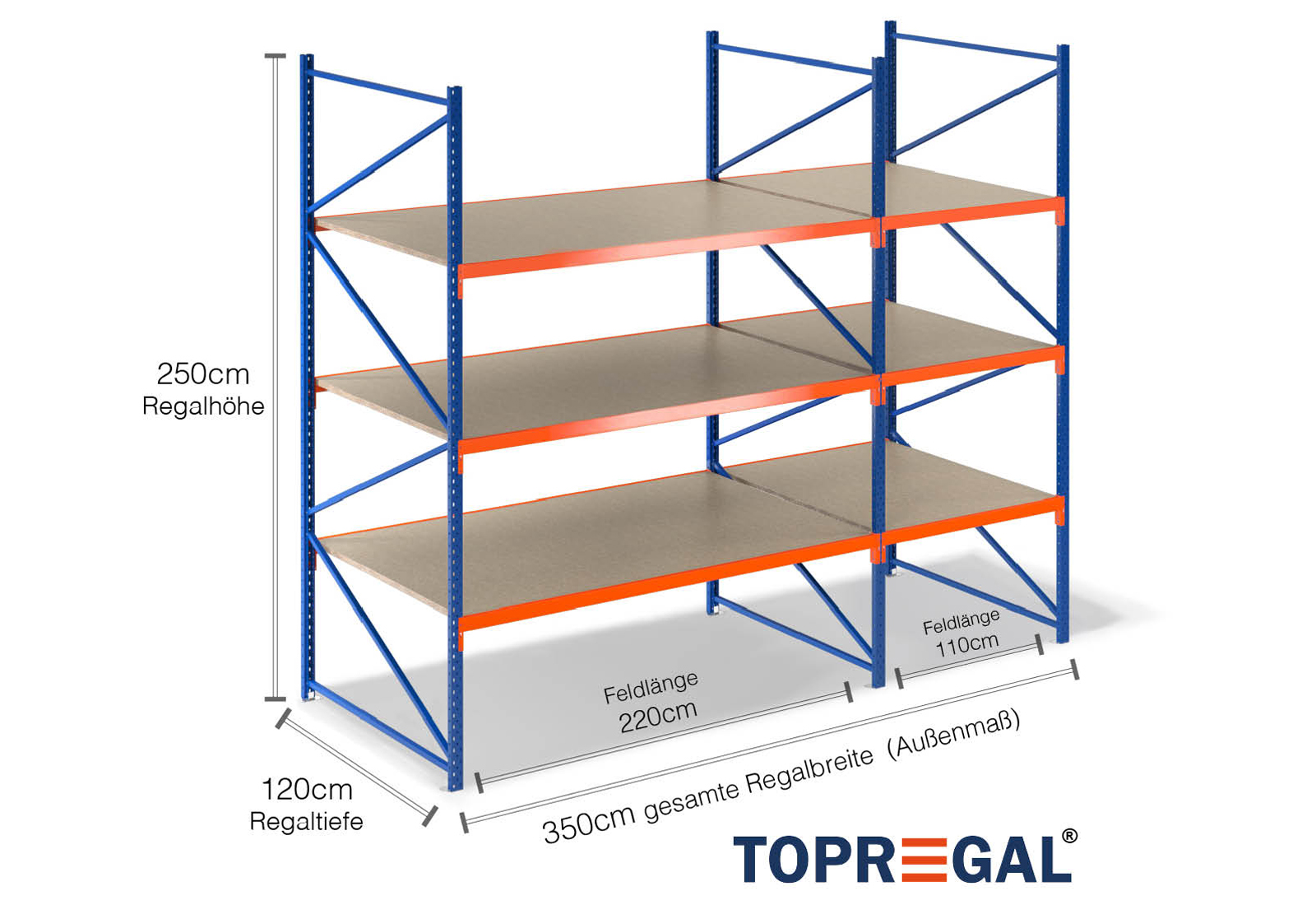 Tento skladovací regál vyniká svou výškou 2,5 m, je 120 cm hluboký a má šířku 3,5 m. Každá z 3 úrovní poskytuje maximální nosnost 500 kg, přičemž se nesmí překročit maximální zatížení mezi dvěma stojany (nosnost pole) 2.000 kg. Tyto údaje se vždy vztahují na rovnoměrné celkové zatížení regálů. Montáž probíhá díky zásuvnému systému bez problému a rychle. Pro regály se širokým rozpětím TOPREGAL je kromě toho k dispozici rozsáhlý výběr jednotlivých dílů a příslušenství, jako např. regálové stojany, traverzy, magnetické pásky a plastové boxy.