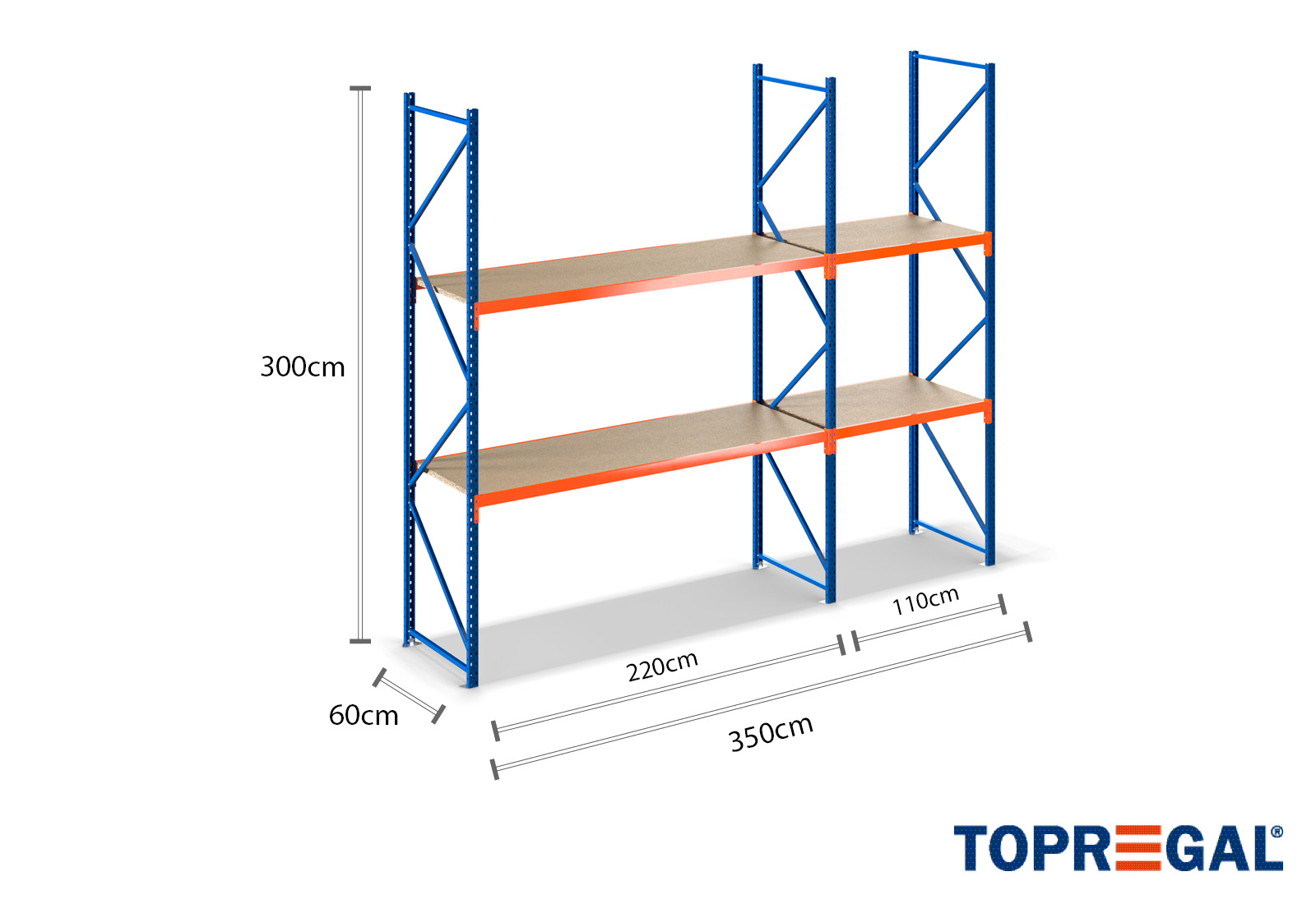 Tento skladovací regál vyniká svou výškou 3 m, je 60 cm hluboký a má šířku 3,5 m. Každá z 2 úrovní poskytuje maximální nosnost 500 kg, přičemž se nesmí překročit maximální zatížení mezi dvěma stojany (nosnost pole) 2.000 kg. Tyto údaje se vždy vztahují na rovnoměrné celkové zatížení regálů. Montáž probíhá díky zásuvnému systému bez problému a rychle. Pro regály se širokým rozpětím TOPREGAL je kromě toho k dispozici rozsáhlý výběr jednotlivých dílů a příslušenství, jako např. regálové stojany, traverzy, magnetické pásky a plastové boxy.