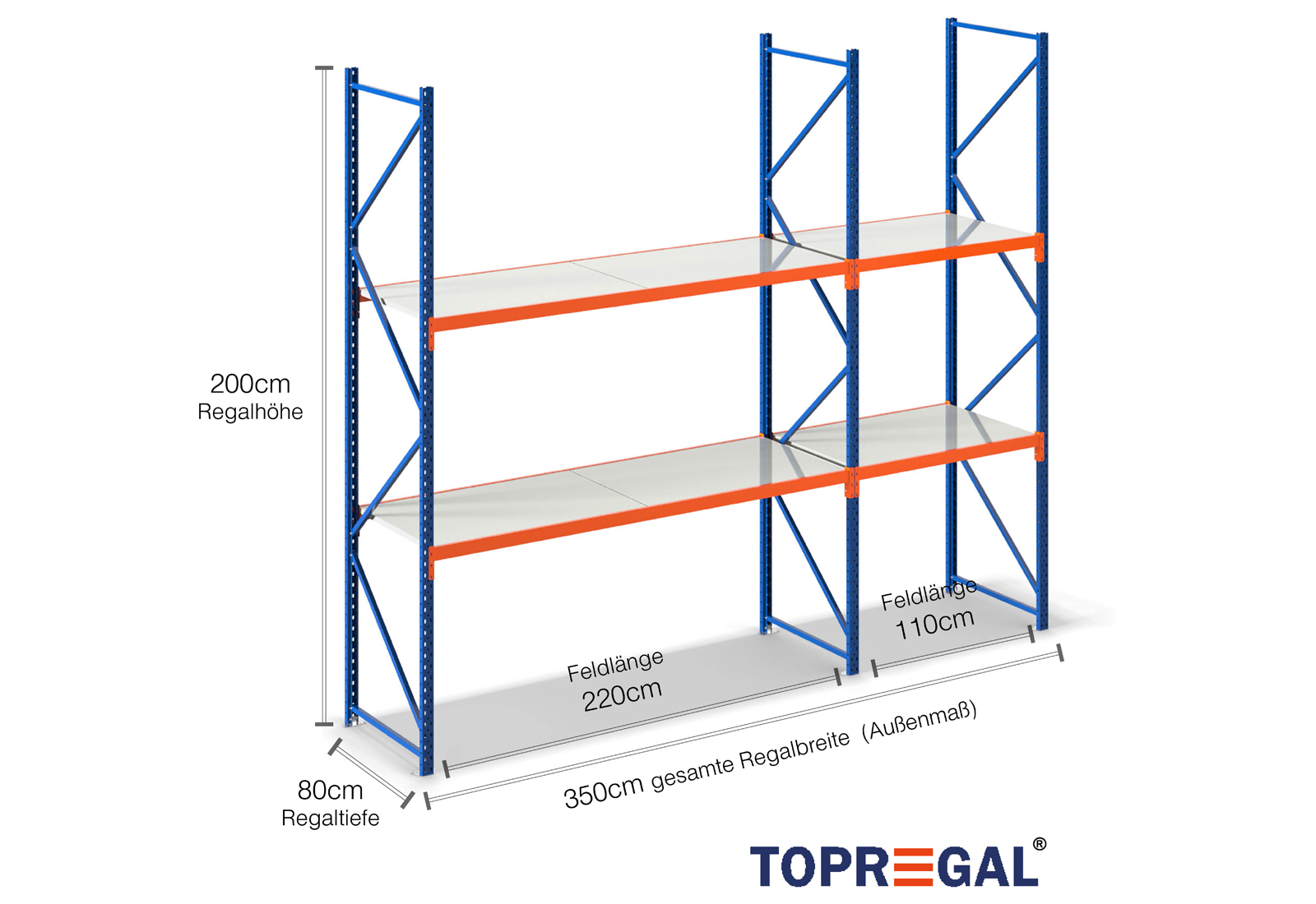 Tento skladovací regál vyniká svou výškou 2 m, je 80 cm hluboký a má šířku 3,5 m. Každá z 2 úrovní poskytuje maximální nosnost 500 kg, přičemž se nesmí překročit maximální zatížení mezi dvěma stojany (nosnost pole) 2.000 kg. Tyto údaje se vždy vztahují na rovnoměrné celkové zatížení regálů. Montáž probíhá díky zásuvnému systému bez problému a rychle. Pro regály se širokým rozpětím TOPREGAL je kromě toho k dispozici rozsáhlý výběr jednotlivých dílů a příslušenství, jako např. regálové stojany, traverzy, magnetické pásky a plastové boxy.