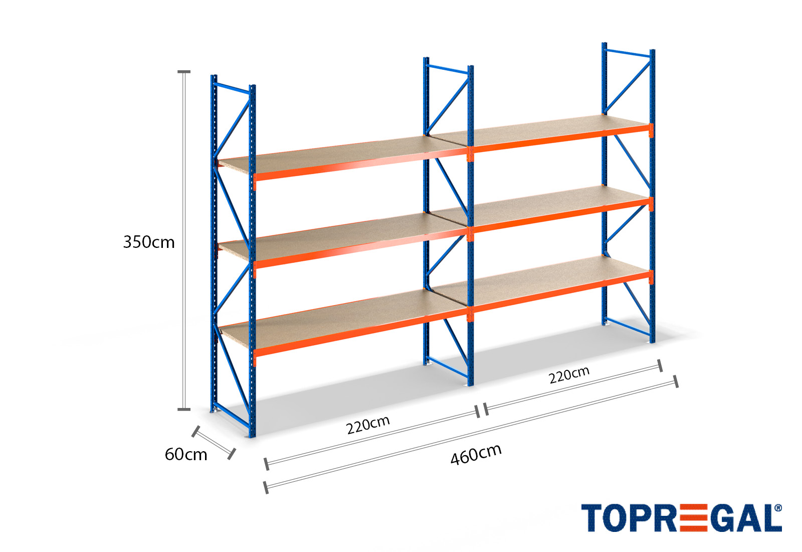 Tento skladovací regál vyniká svou výškou 3,5 m, je 60 cm hluboký a má šířku 4,6 m. Každá z 3 úrovní poskytuje maximální nosnost 500 kg, přičemž se nesmí překročit maximální zatížení mezi dvěma stojany (nosnost pole) 2.000 kg. Tyto údaje se vždy vztahují na rovnoměrné celkové zatížení regálů. Montáž probíhá díky zásuvnému systému bez problému a rychle. Pro regály se širokým rozpětím TOPREGAL je kromě toho k dispozici rozsáhlý výběr jednotlivých dílů a příslušenství, jako např. regálové stojany, traverzy, magnetické pásky a plastové boxy.