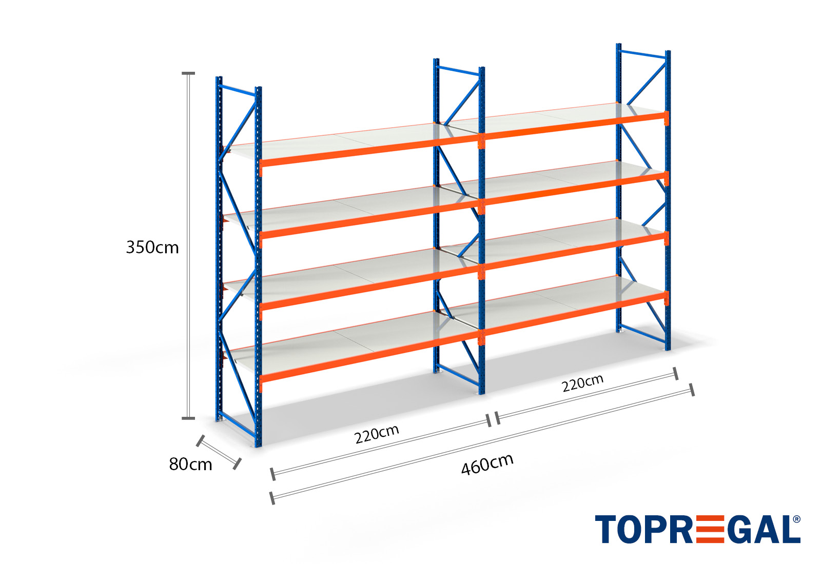 Tento skladovací regál vyniká svou výškou 3,5 m, je 80 cm hluboký a má šířku 4,6 m. Každá z 4 úrovní poskytuje maximální nosnost 500 kg, přičemž se nesmí překročit maximální zatížení mezi dvěma stojany (nosnost pole) 2.000 kg. Tyto údaje se vždy vztahují na rovnoměrné celkové zatížení regálů. Montáž probíhá díky zásuvnému systému bez problému a rychle. Pro regály se širokým rozpětím TOPREGAL je kromě toho k dispozici rozsáhlý výběr jednotlivých dílů a příslušenství, jako např. regálové stojany, traverzy, magnetické pásky a plastové boxy.