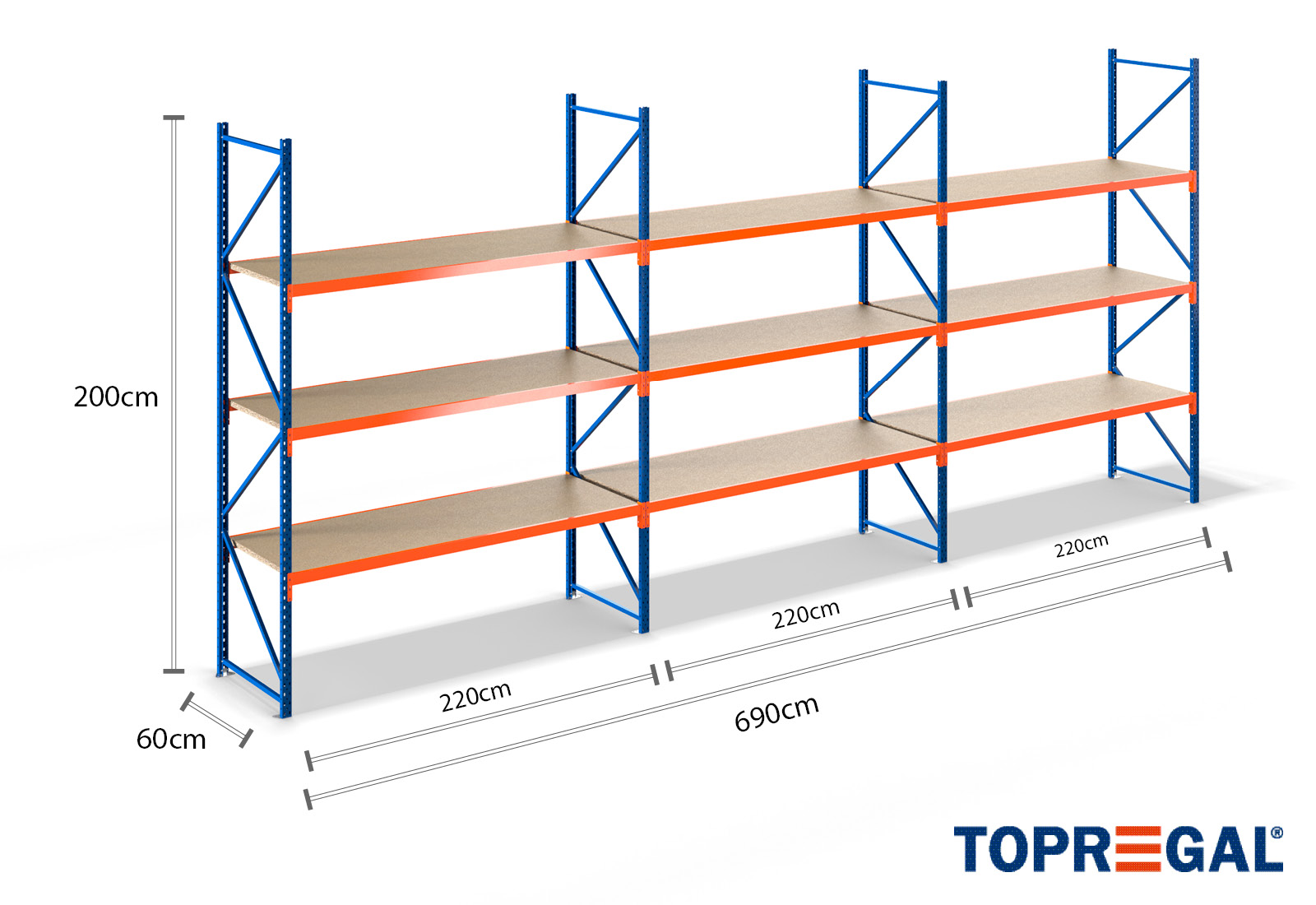 Tento skladovací regál vyniká svou výškou 2 m, je 60 cm hluboký a má šířku 6,9 m. Každá z 3 úrovní poskytuje maximální nosnost 500 kg, přičemž se nesmí překročit maximální zatížení mezi dvěma stojany (nosnost pole) 2.000 kg. Tyto údaje se vždy vztahují na rovnoměrné celkové zatížení regálů. Montáž probíhá díky zásuvnému systému bez problému a rychle. Pro regály se širokým rozpětím TOPREGAL je kromě toho k dispozici rozsáhlý výběr jednotlivých dílů a příslušenství, jako např. regálové stojany, traverzy, magnetické pásky a plastové boxy.