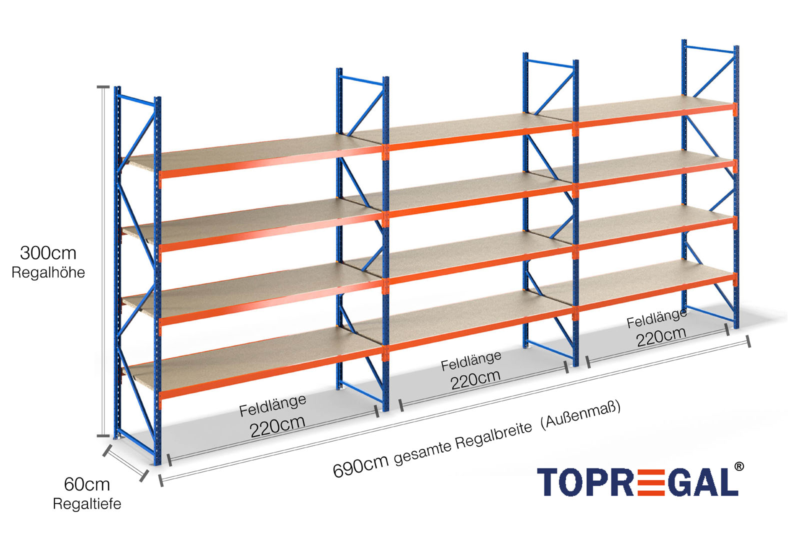 Tento skladovací regál vyniká svou výškou 3 m, je 60 cm hluboký a má šířku 6,9 m. Každá z 4 úrovní poskytuje maximální nosnost 500 kg, přičemž se nesmí překročit maximální zatížení mezi dvěma stojany (nosnost pole) 2.000 kg. Tyto údaje se vždy vztahují na rovnoměrné celkové zatížení regálů. Montáž probíhá díky zásuvnému systému bez problému a rychle. Pro regály se širokým rozpětím TOPREGAL je kromě toho k dispozici rozsáhlý výběr jednotlivých dílů a příslušenství, jako např. regálové stojany, traverzy, magnetické pásky a plastové boxy.