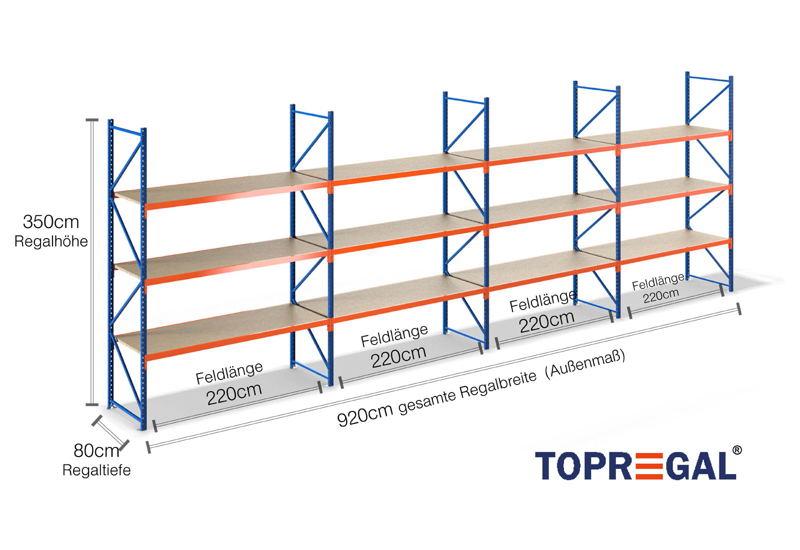Tento skladovací regál vyniká svou výškou 3,5 m, je 80 cm hluboký a má šířku 9,2 m. Každá z 3 úrovní poskytuje maximální nosnost 500 kg, přičemž se nesmí překročit maximální zatížení mezi dvěma stojany (nosnost pole) 2.000 kg. Tyto údaje se vždy vztahují na rovnoměrné celkové zatížení regálů. Montáž probíhá díky zásuvnému systému bez problému a rychle. Pro regály se širokým rozpětím TOPREGAL je kromě toho k dispozici rozsáhlý výběr jednotlivých dílů a příslušenství, jako např. regálové stojany, traverzy, magnetické pásky a plastové boxy.